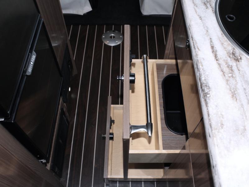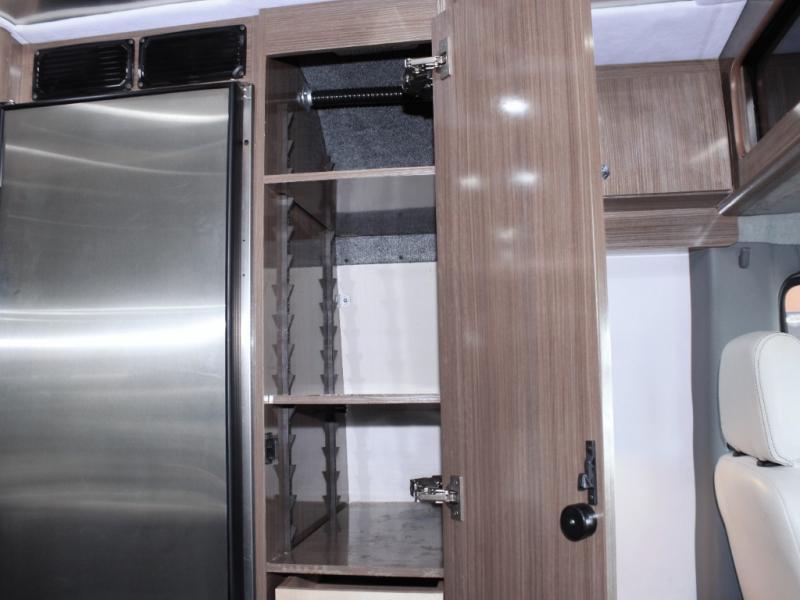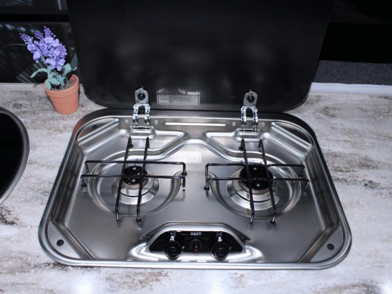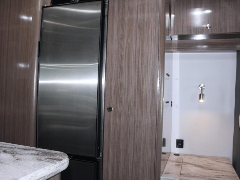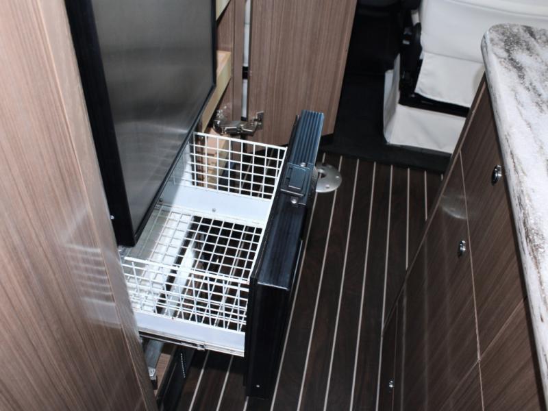 The galley has a sink, two burner range, and flip-up shelf along one side. The opposite side offers a large pantry/wardrobe and a refrigerator with freezer.