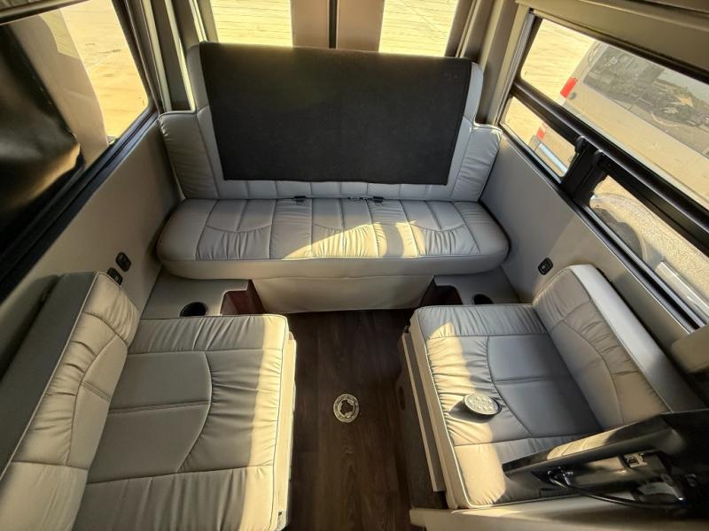 This American Patriot class B diesel offers a wet bath with a shower, sink and porcelain toilet with dual entrance doors allowing you to skip the public facilities, plus provides kitchen amenities. You can make dinner in the convection microwave and store your perishables in the refrigerator. There is even an induction cooktop if you need to boil some eggs. You will also find plenty of overhead cabinets for your dishes, dry goods and such. You can stop dreaming about comfortable custom seating while you travel when you try out the two captain's chairs that swivel, the single opposing seats and the rear lounge. You might even want to take a nap as well. Dreams do come true, take a look today!