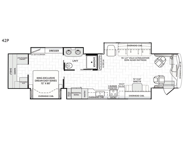 Opposite the dinette and kitchen you will find a living area that will provide you with comfortable seating at a slide out 95 1/2" Villa ultraleather sofa with air mattress, and a lounge chair. There is storage above the sofa which also features three sets of seat belts for your rear travelers. Adjacent to the lounge chair you will find a 49" LED TV for your viewing pleasure. There is a 32" LED TV above the overhead cab area.