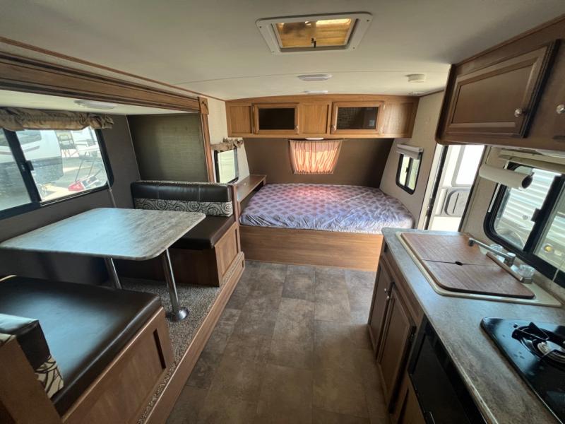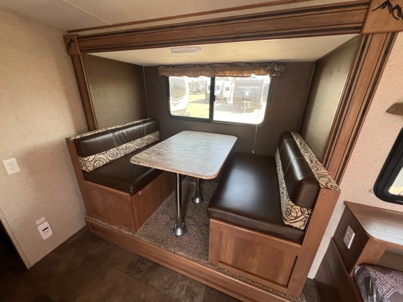 Straight ahead through the entry door find a dinette slide out which is the perfect spot for meals and also for just sitting and hanging out.