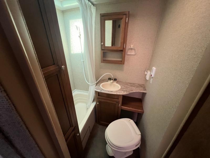 In the rear right corner find a set of 30" x 74" bunks that the kids will enjoy. The opposite corner offers a tub/shower, wardrobe, toilet, and vanity with sink, plus medicine cabinet overhead.