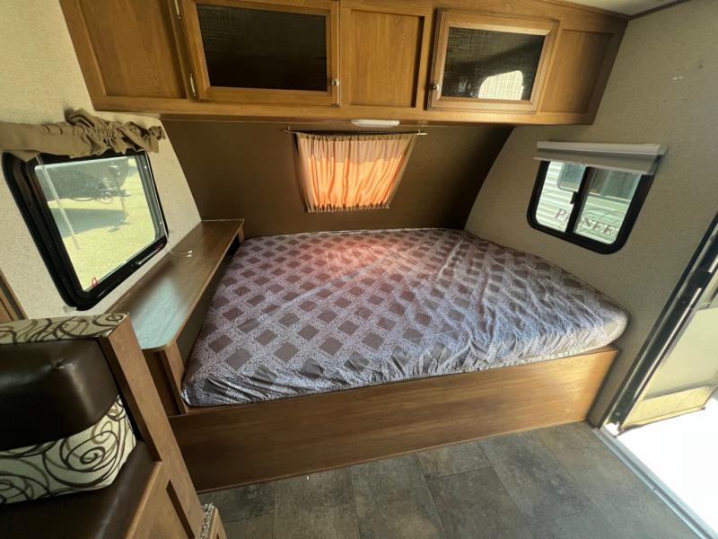 Step inside model 193BHS and find a queen size bed turned sideways at the front of the unit. You will also like that it features a large overhead storage cabinet along the front wall.
