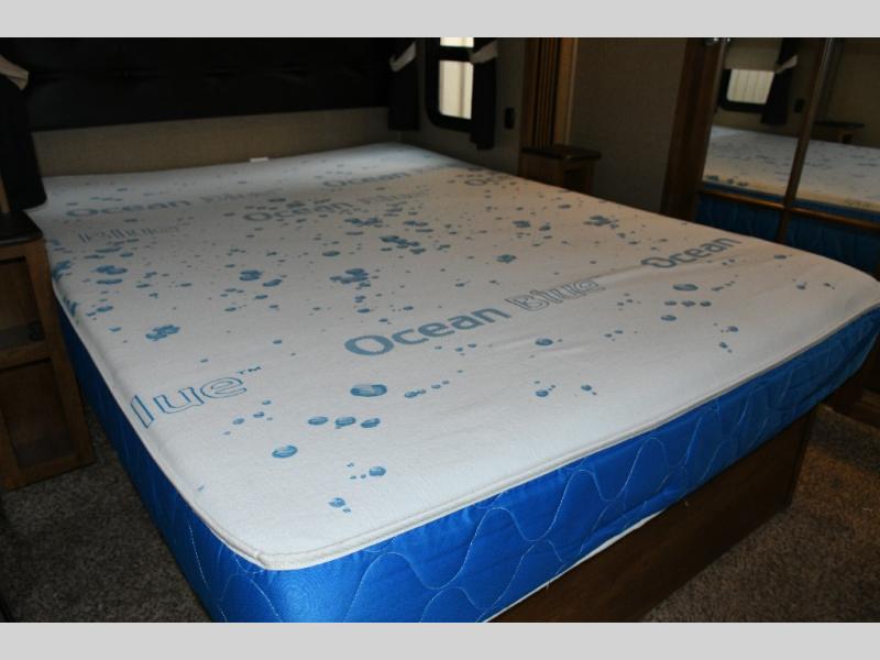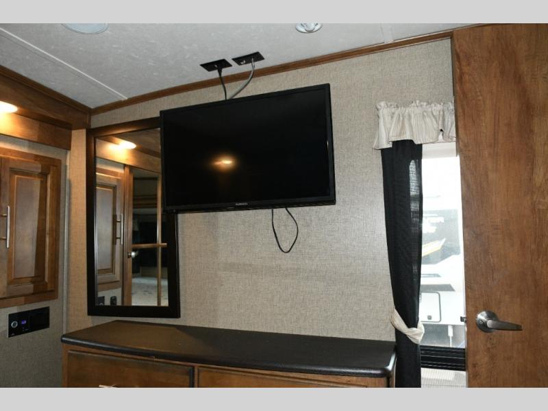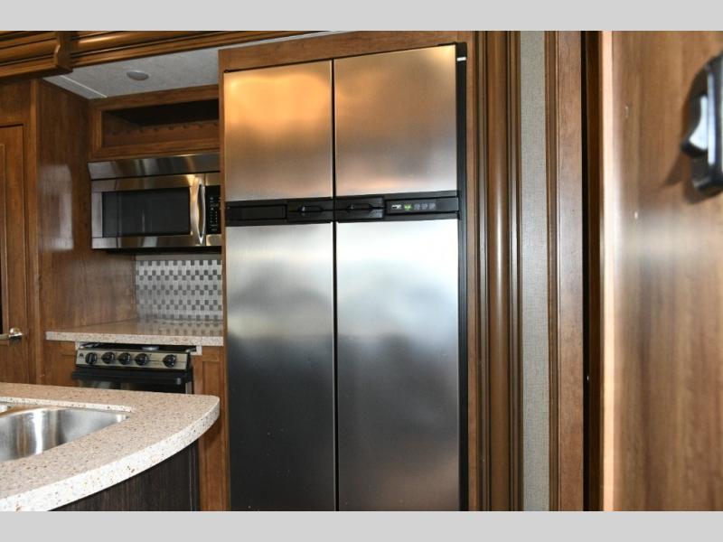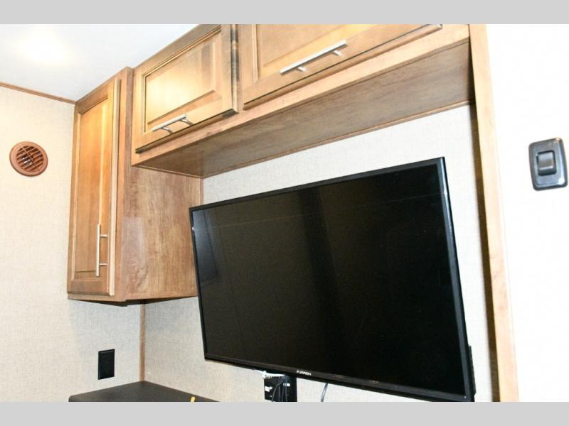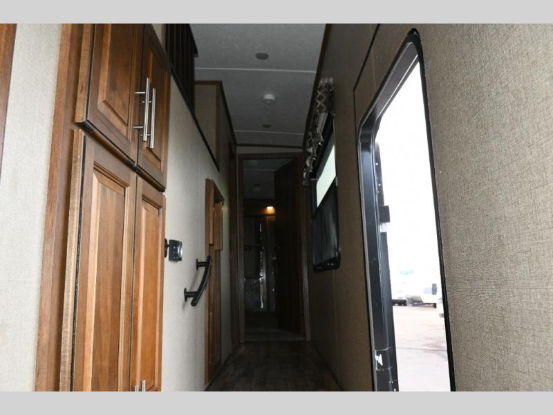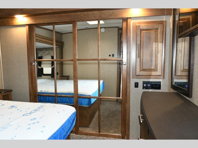 What I liked most: Good amount of exterior storage in the underbelly and a nice little refrigerator and sink outside as well. Cute little nightstand with close electrical outlets in the master bedroom as well as plenty of storage with full chest of drawers and a beautiful big wardrobe. Extra long island in the kitchen with lots of drawers and cabinets space. Very nice full door pantry with pullout shelves. Side-by-side refrigerator freezer. Very nice second bedroom area with couch, bunk, dinette table, entertainment center, and lots of storage. On top of that. Is a really cool loft area that you can access from the hallway for extra sleeping. Maybe for the grand kids. Living area has theater seating directly across from the built-in entertainment center with fireplace in this model. Sofa in the rear the RV has really nice little shelving storage units on either side. Wine rack above microwave. Many nice little touches like hooks for coats and a wardrobe in the hall as soon as you enter the RV.