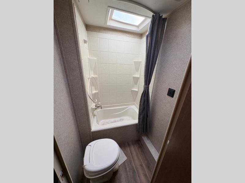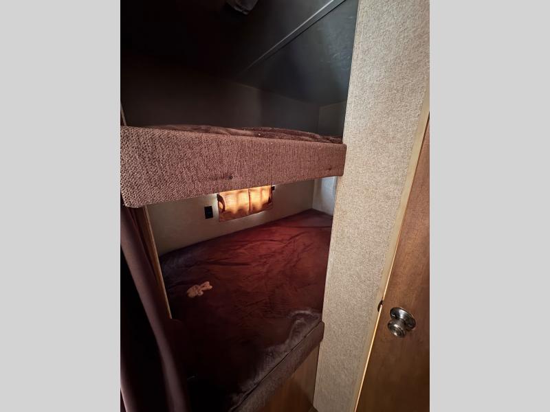 There is more sleeping space in the rear of this unit where you will find a set of double bed bunks on the left side. A complete bath is next to the bunks making it extremely convenient, especially at night. The bathroom offers a full tub, toilet, and the vanity with sink and medicine cabinet is just outside the door.