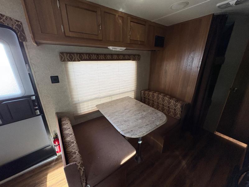 Enjoy your meals while seated at the booth dinette with TV mount opposite the kitchen amenities. There is overhead storage above to keep things tidy. A nearby sofa is along the interior wall facing the rear of the trailer.