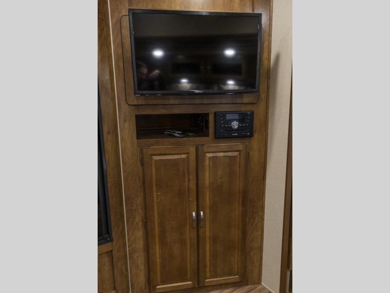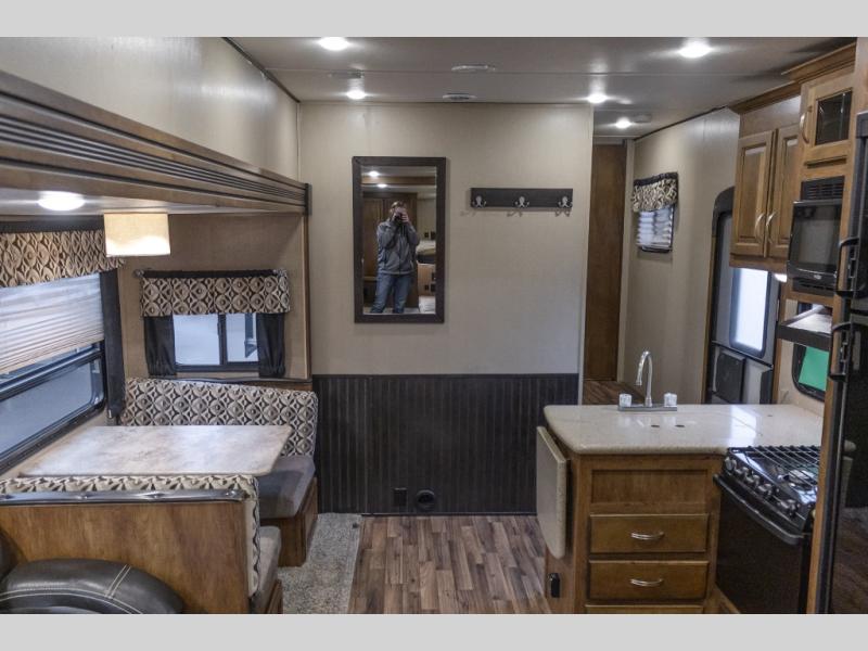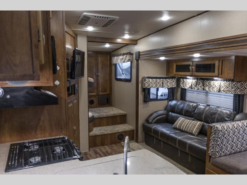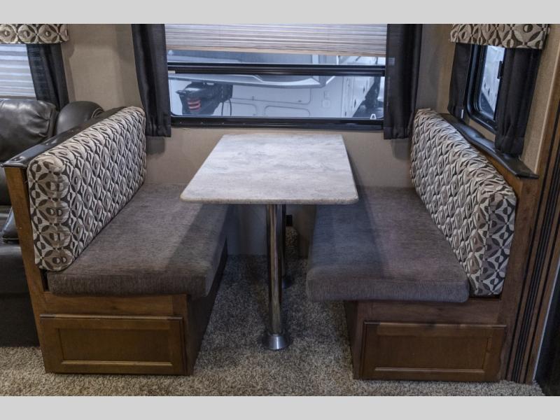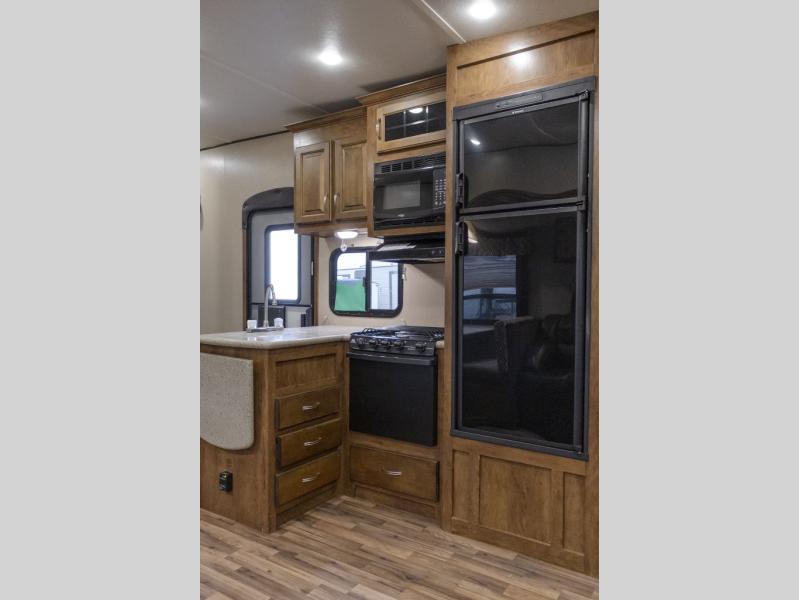 As you enter this model, you will love how open and spacious the combined kitchen and living area are! Here there is a slide out along the road side. The slide features a dinette and a tri-fold sofa with an overhead cabinet. Both the sofa and dinette can easily convert into additional sleeping space at night.