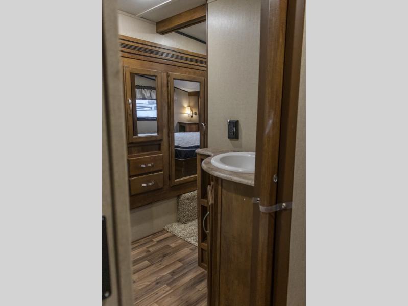 Heading toward the front of the fifth wheel, there is a step up to the bathroom and bedroom area. The side aisle bathroom features a toilet, a corner shower, and a sink. A sliding door closes off the bathroom from the bedroom.