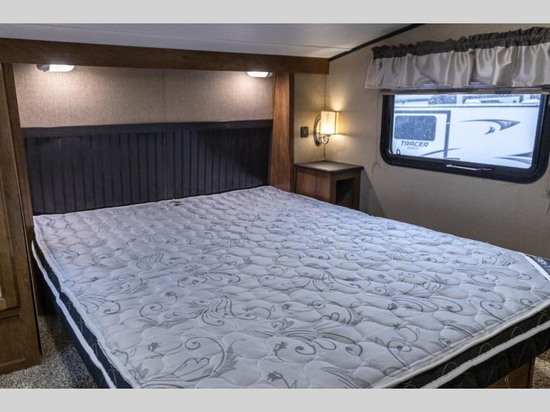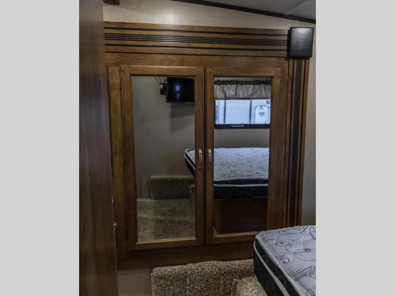 In the front bedroom there is a queen bed, a nightstand, and a wardrobe. There is also a slide out with a wardrobe and in the bathroom the slide continues with a linen cabinet.