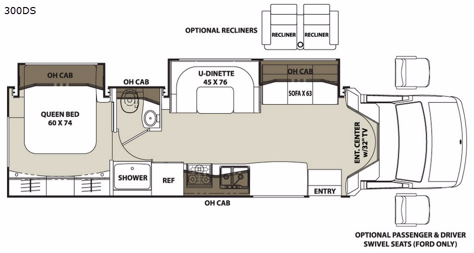 Straight ahead when you enter notice the large slide out sofa and u-shaped dinette. Both offer much seating space to enjoy a meal at, or to just relax and kick back after a fun filled day of adventure and exploring. You will also enjoy the 32" TV provided in the entertainment center located above the cab area.