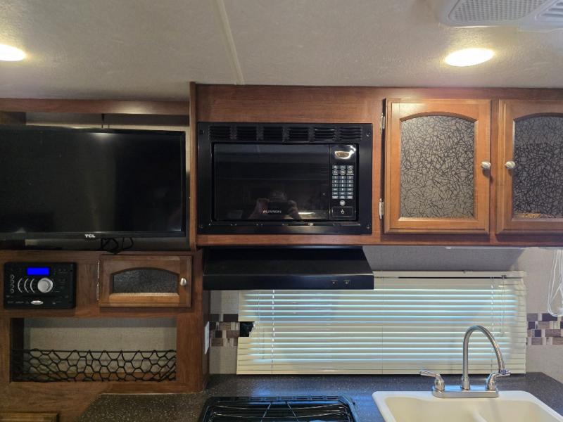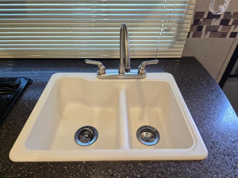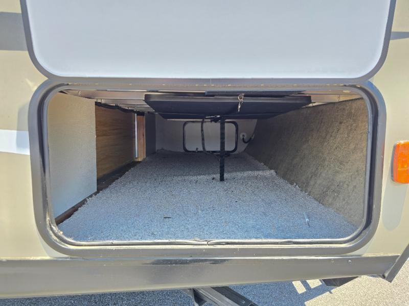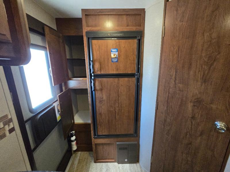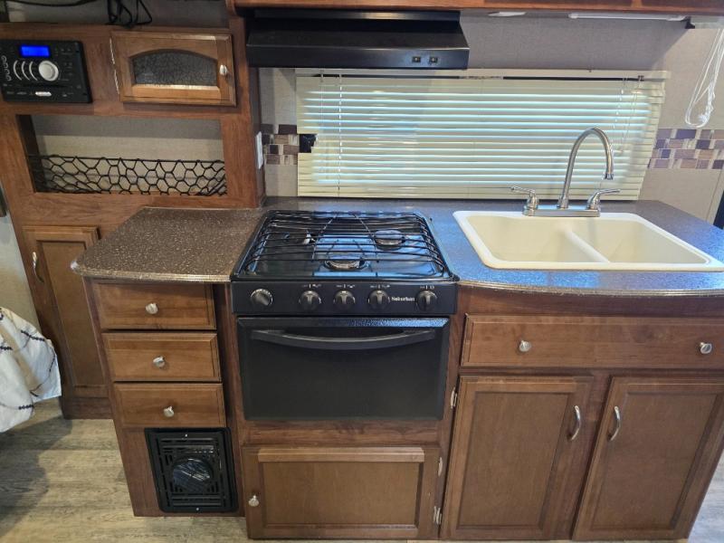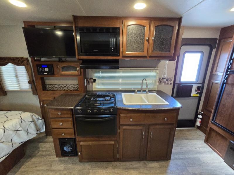 Make all your meals easily inside with a convenient three burner range and microwave oven. There is also a refrigerator to keep your perishables fresh, and a double kitchen sink for cleaning up. You will find that there is plenty of storage throughout in the available overhead cabinets, rear entry hutch, and front pass-through storage compartment outside as well.