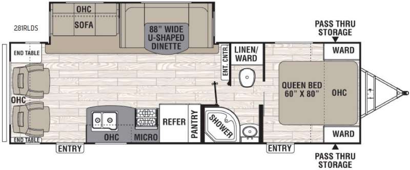 Throughout this unit you will find plenty of storage with all of the overhead cabinets. On the outside you will also be pleasantly surprised by the large pass-thru storage compartment beneath the head of the bed, and so much more!