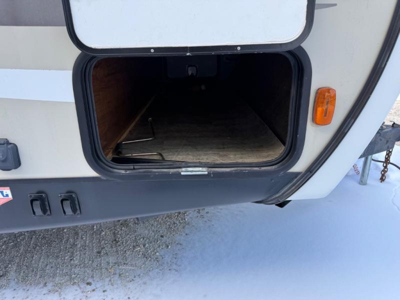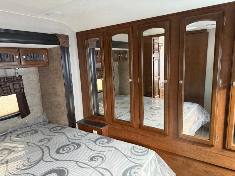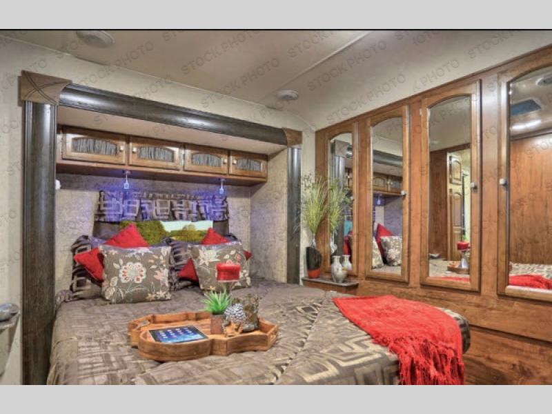 A sliding hallway door leads into the front private master bedroom which features its own exterior entry/exit door. Inside find a queen bed slide out, a dresser, and a full front wardrobe with exterior pass-through storage beneath, and so much more!