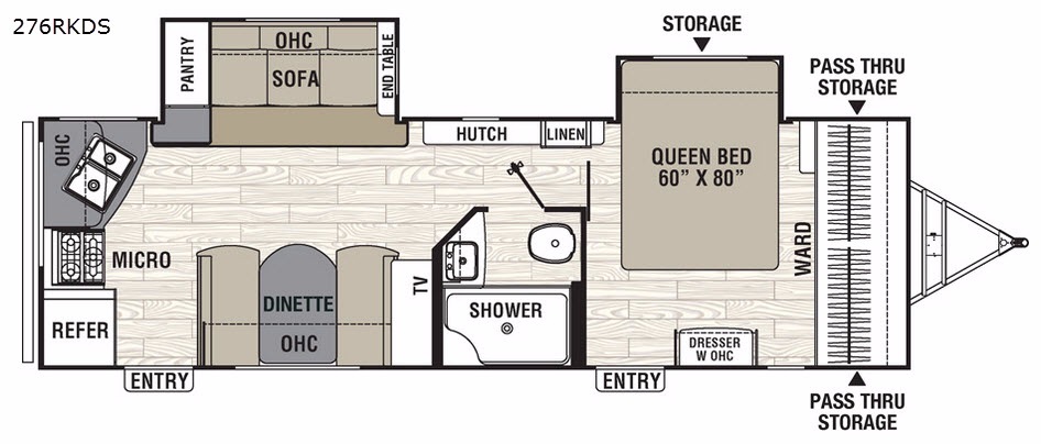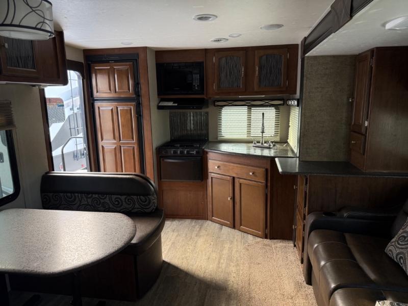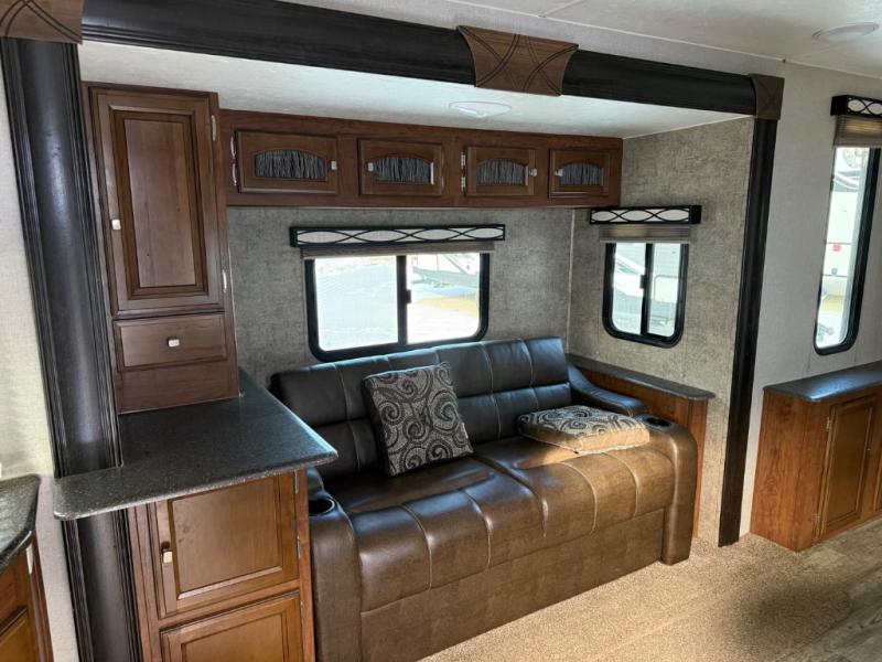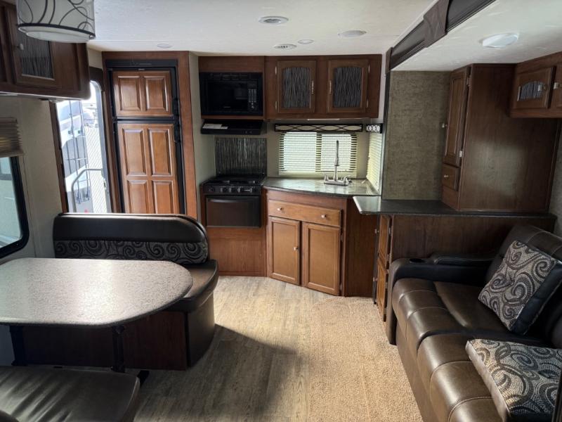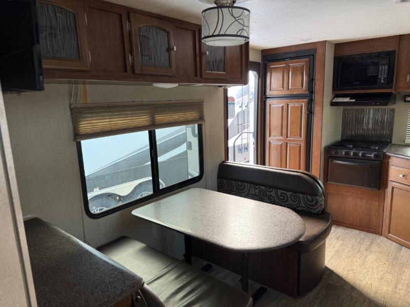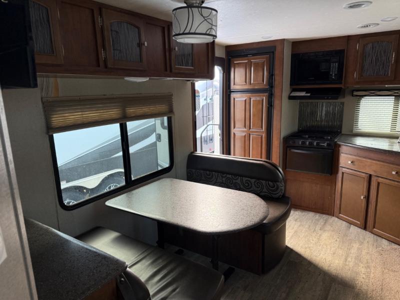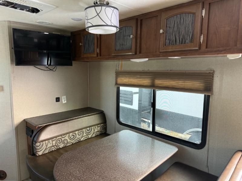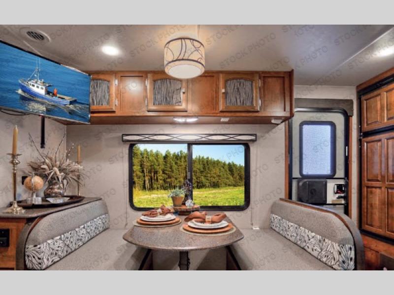 Straight in the door find a slide out sofa with end table including storage above, plus a pantry. More seating is available on the opposite side in the booth dinette that also features overhead cabinets, and a flat screen TV along the outer bathroom wall.