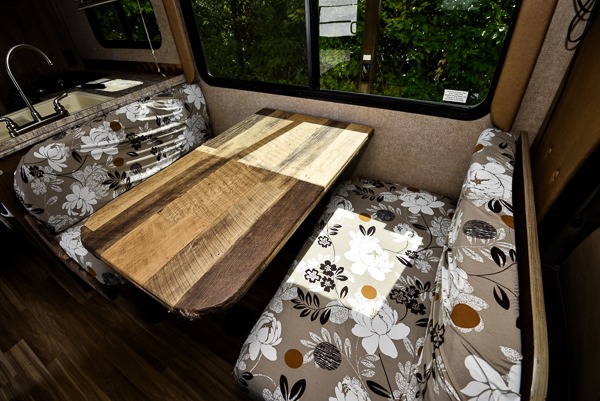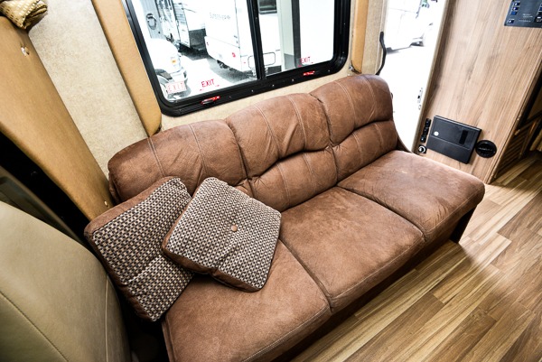 Model 27QB has a side entry door that leads right into the main living space where you will find a sofa on your right opposite a 42" x 71" booth dinette, both with overhead storage.
