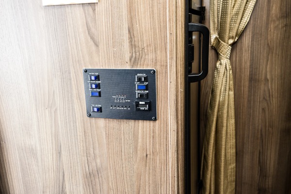 The very rear of the coach is where you can relax and enjoy a great nights sleep. There is a queen size bed with nightstand on one side and wardrobes for hanging clothes on both sides, plus an overhead cabinet to keep things neat and organized.