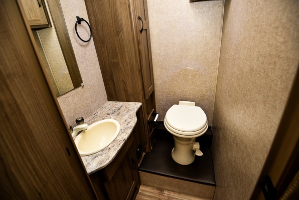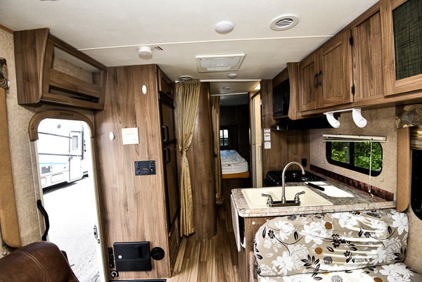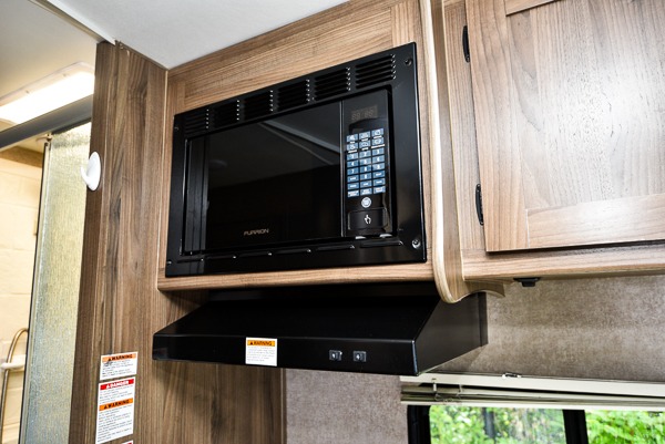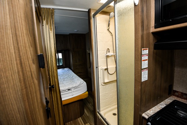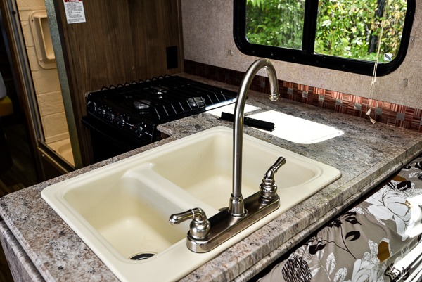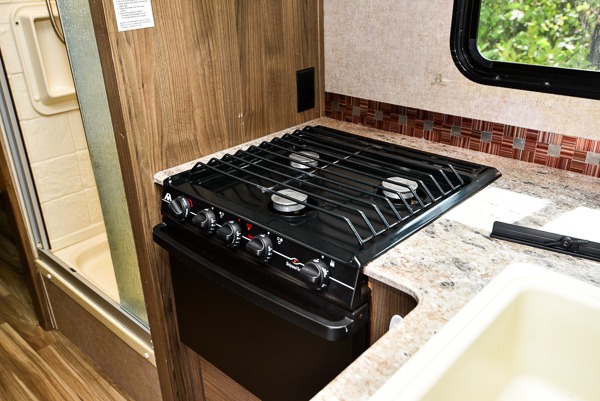 To the left of the side entry door find the refrigerator, and across from that is the rest of the kitchen amenities including a double sink, a three burner range, overhead microwave, and counter top extension. You will also find plenty of storage space for your dishes and things as well.