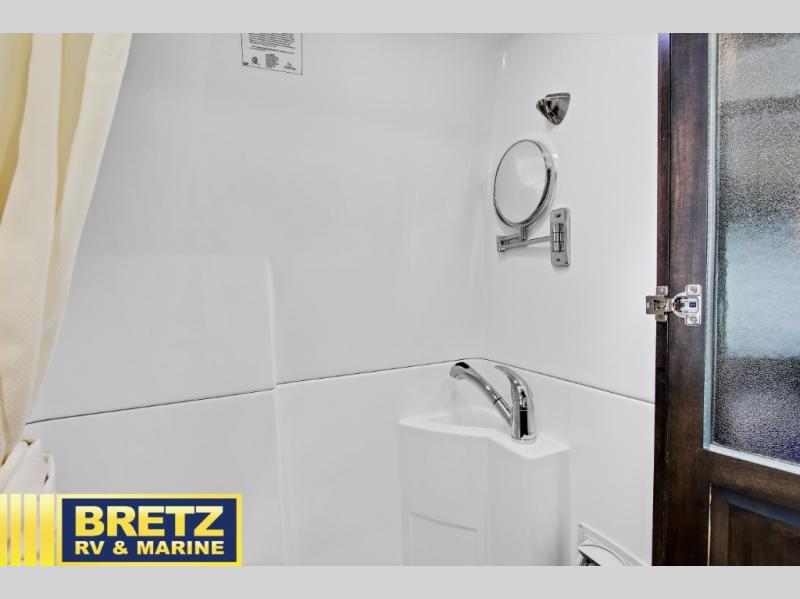 Mid coach you will find a wet bath along the passenger side featuring a shower, toilet, and a sink combination which is convenient as you travel.