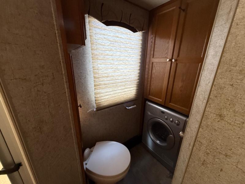 Along the curb side beyond the refrigerator you will enjoy the convenience of a complete bath including a tub/shower, a toilet, and a corner vanity with sink. There is also a linen cabinet, and a washer/dryer area as well. A second bath entry door allows easy access into the rear bedroom for added convenience.