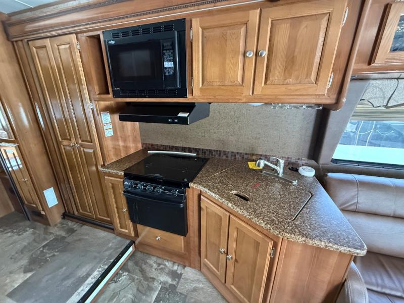 The road side slide that features the sofa also features the kitchen area where you will find a three burner range with overhead microwave oven, a double sink, and across the aisle a residential refrigerator. You will also find overhead cabinetry for your daily dishes and things, plus a pantry within the slide for all of your dry and canned goods up one step to finish out the slide. A second smaller pantry is found just off the slide outside the rear bedroom.
