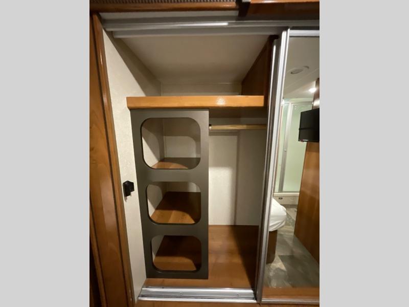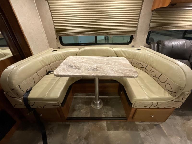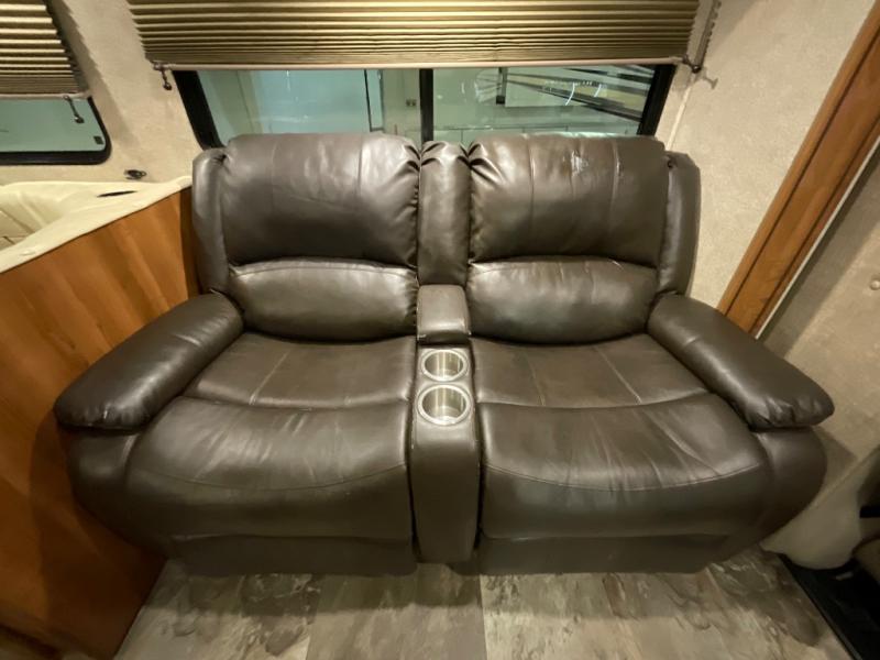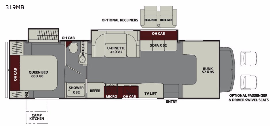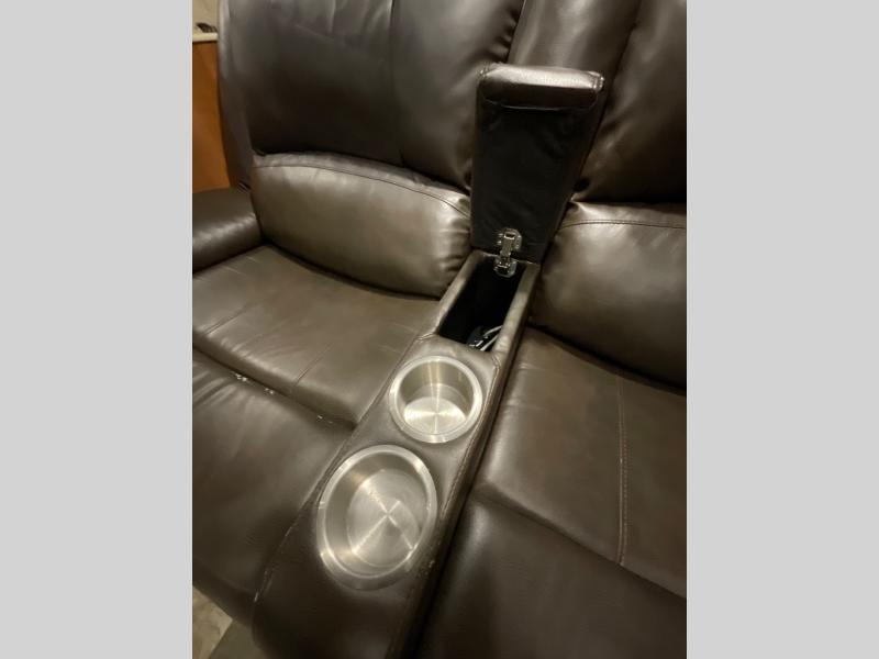 Straight in the entry door find a sofa and u-shaped dinette slide out including cabinets for storage above the sofa. You may choose the optional recliners instead. To the left of the entry door there is a power lift TV to enjoy from any seating space in the room.