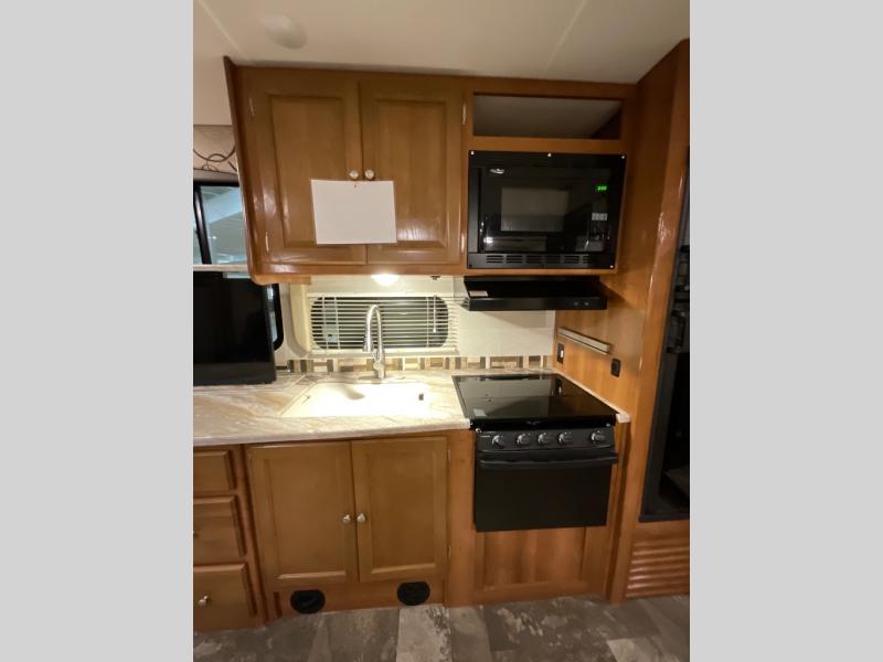 The kitchen offers everything needed to create light meals and snacks as you travel. There is a double sink for cleaning up, a three burner range, an overhead microwave oven, plus refrigerator. There are also overhead cabinets above the counter for storing your dishes and other kitchen items as well.