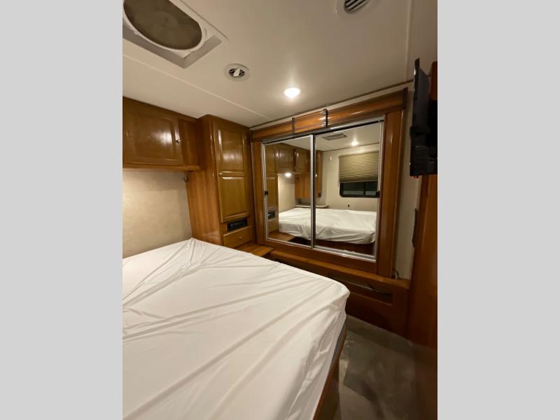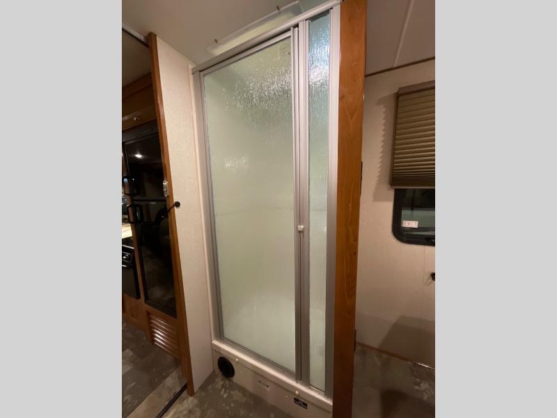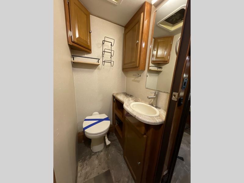 Head towards the rear of the coach and walk through the complete bath including a 32" shower on your left side, and a toilet with vanity and sink including a medicine cabinet on your right.