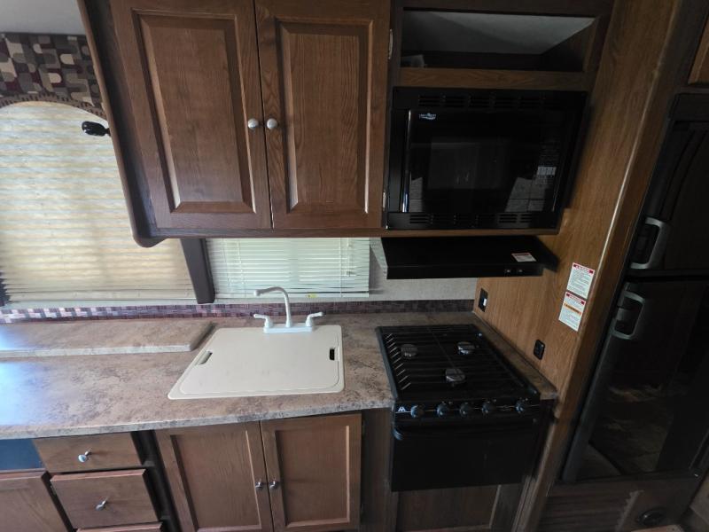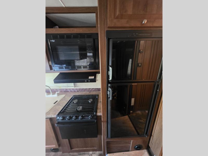 The kitchen offers everything needed to create light meals and snacks as you travel. There is a double sink for cleaning up, a three burner range, an overhead microwave oven, plus refrigerator. There are also overhead cabinets above the counter for storing your dishes and other kitchen items as well.