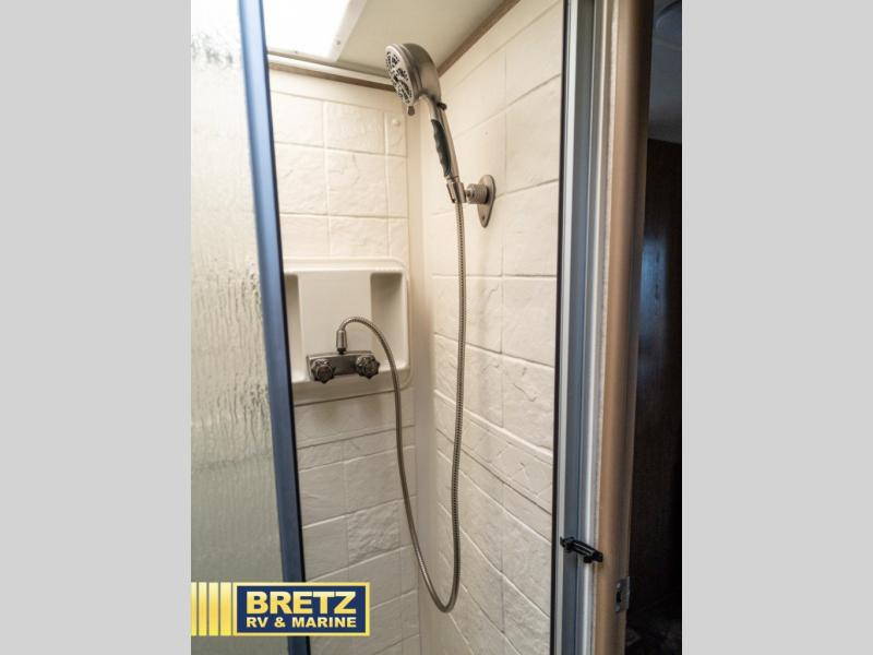 As you head towards the rear of this coach you will find a slide out set of bunk beds on your left. On your right is a complete bath including a shower, linen storage, toilet, and vanity with round sink.