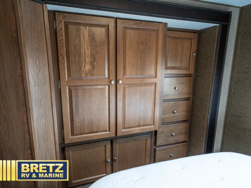 As you enter the rear master bedroom through the space saving sliding door, the curb side slide continues from the bunk beds to the master bedroom closet and dresser allowing more walking around room. The queen bed is on the road side wall and features a nightstand, and wardrobes on either side, plus an overhead cabinet for more storage.