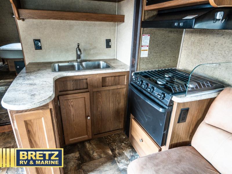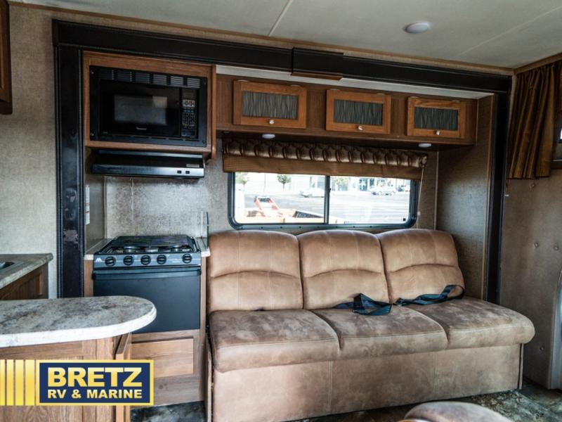 Opposite the dinette is a slide out 75" sofa with storage above, and a three burner range with overhead microwave oven. Adjacent find a double kitchen sink along the interior wall with overhead cabinets for your dishes and things plus a small l-shaped countertop for additional prep space. The refrigerator and pantry are on the opposite side.