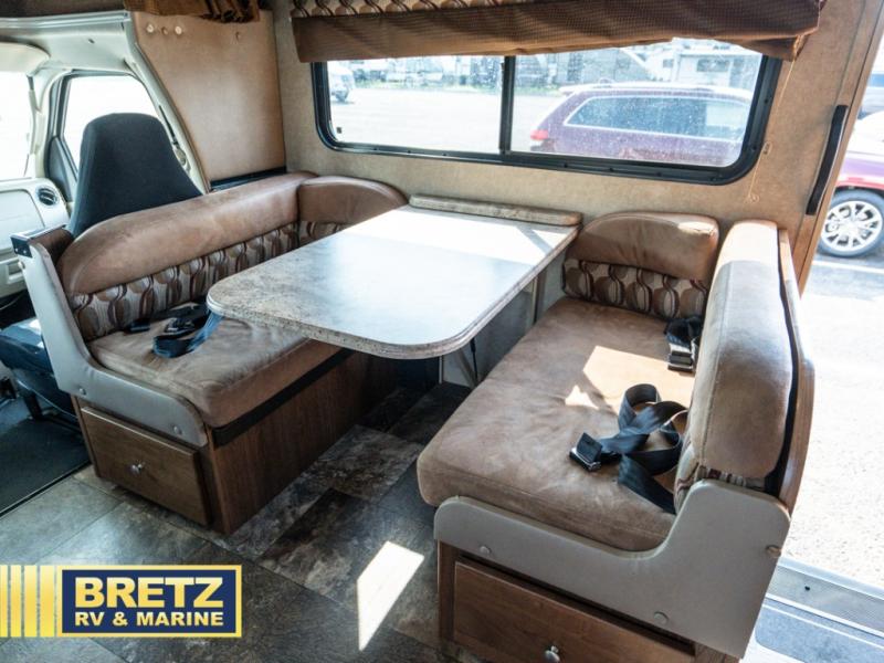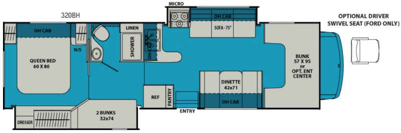 Step inside to your right is a booth dinette including overhead cabinets. The over cab bunk features a 57" x 95" space for sleeping or choose an optional entertainment center instead. You can also choose an optional driver swivel seat.