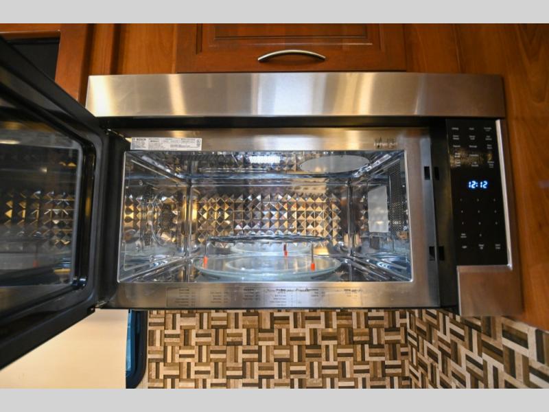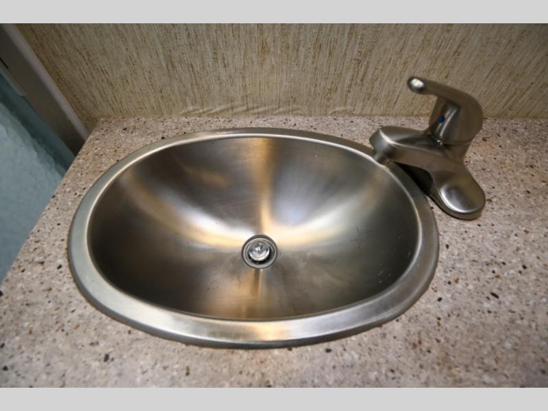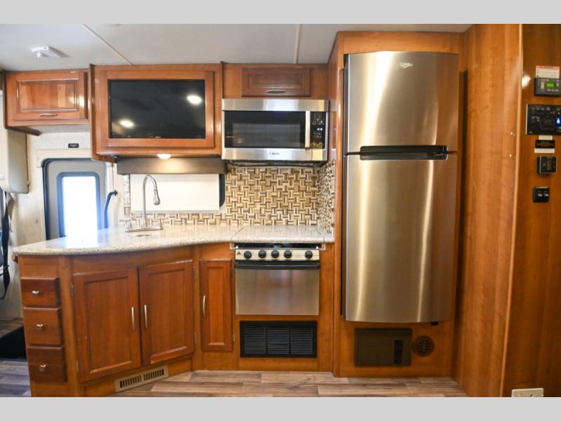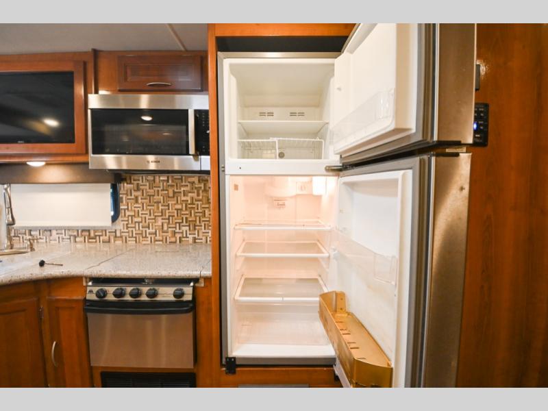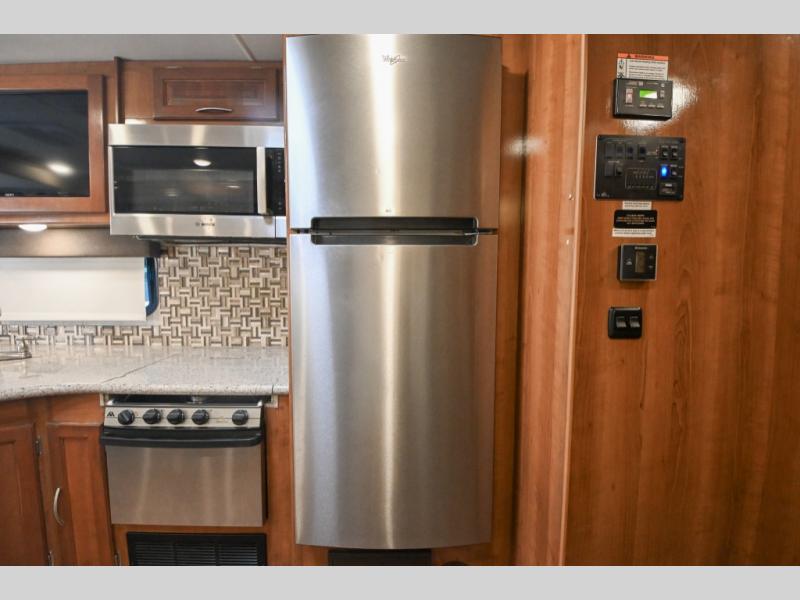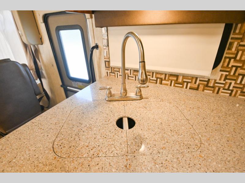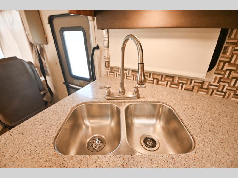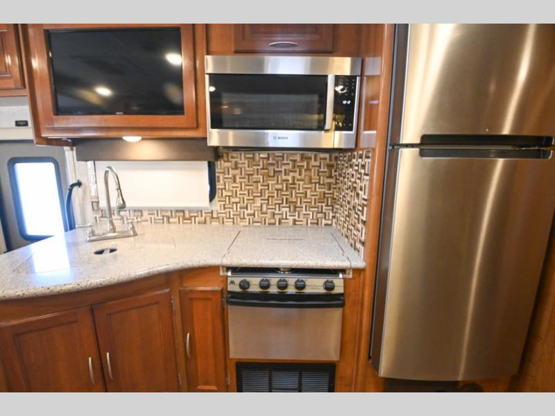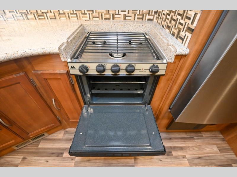 Enter behind the passenger seat and notice the kitchen area to your left. There is a double sink, some counter space, three burner range, and a refrigerator for your perishables. You will also find ample storage in the overhead cabinets, plus in the lower cupboards and drawers too. The TV location is above the sink area which can easily be viewed from the seating in the slide opposite.