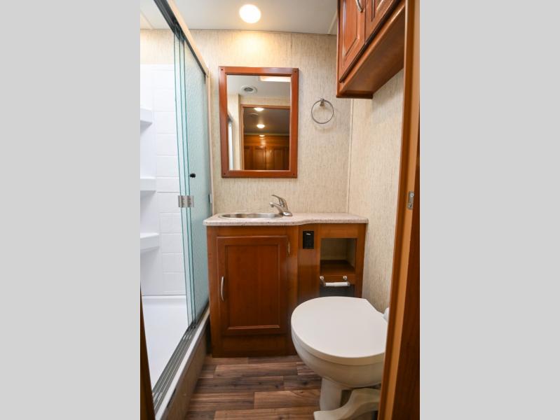 Beyond the dinette there is a pantry and wardrobe for clothing and dry food storage needs. Opposite find a complete bath including a tub/shower, toilet, and vanity with sink.