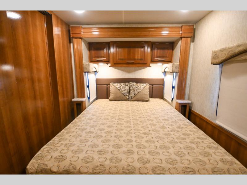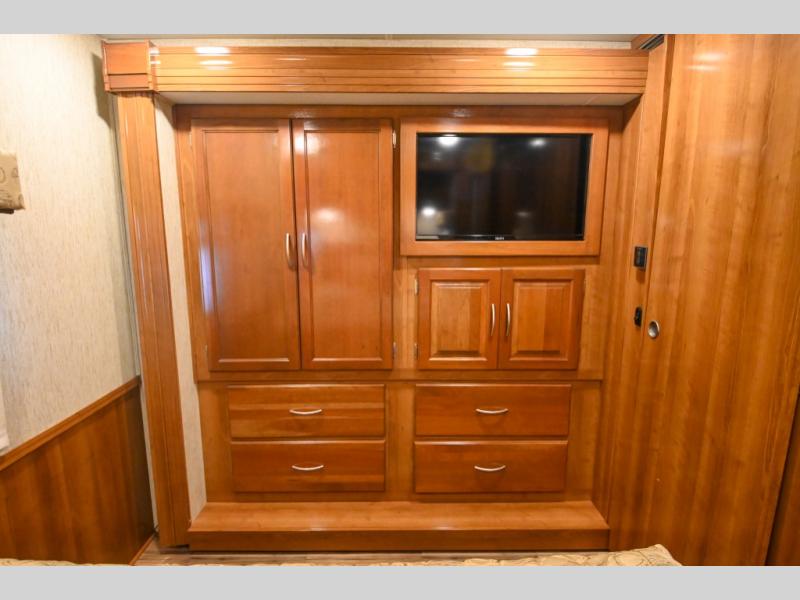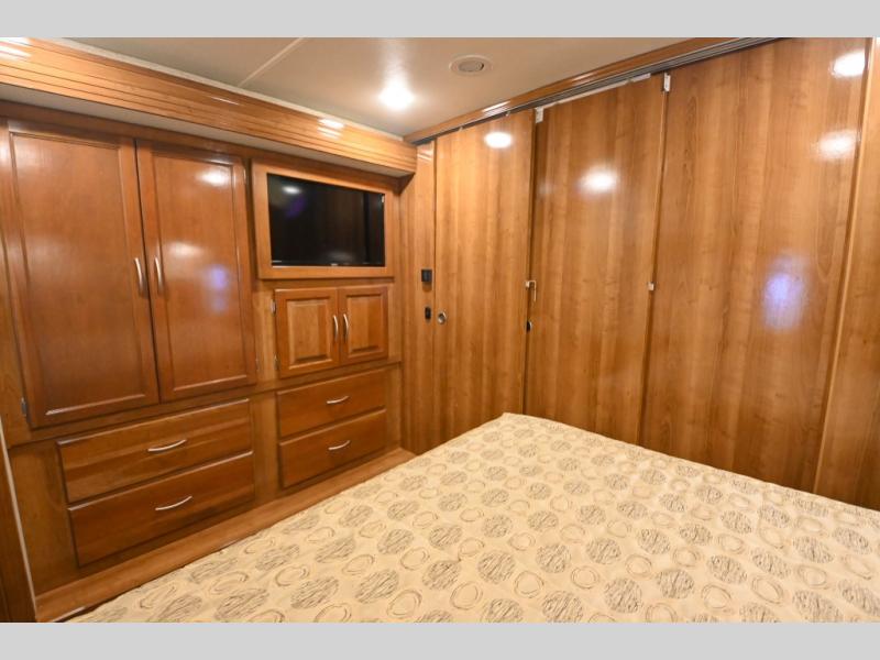 The rear bedroom is quite spacious with a slide out queen bed along the curb side wall which features overhead cabinets for your things. The opposite side of the bedroom finishes out the full wall slide with a wardrobe and TV with storage below.
