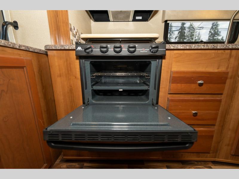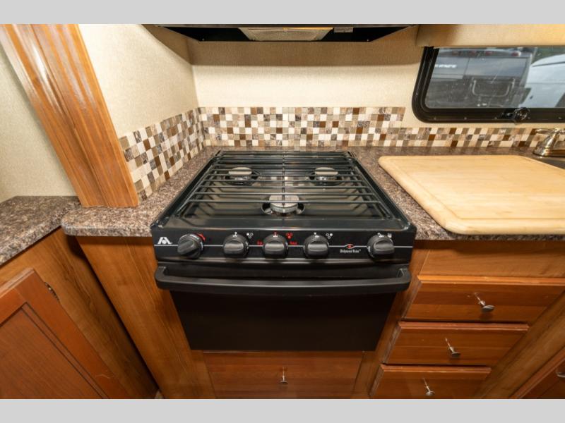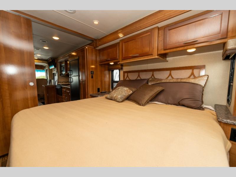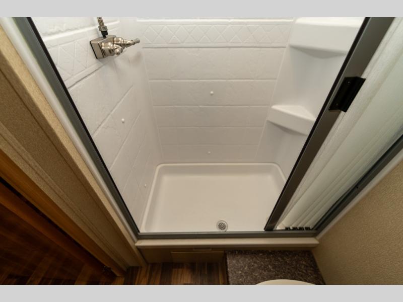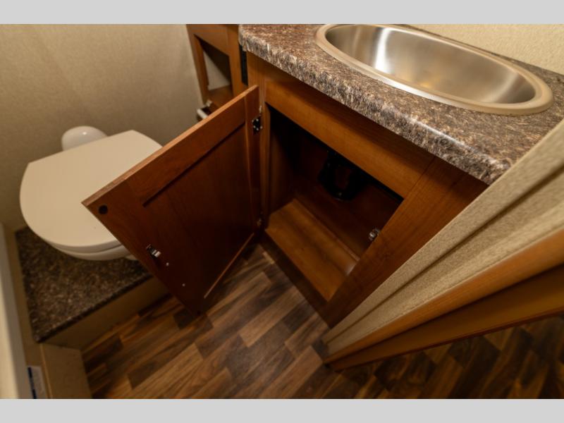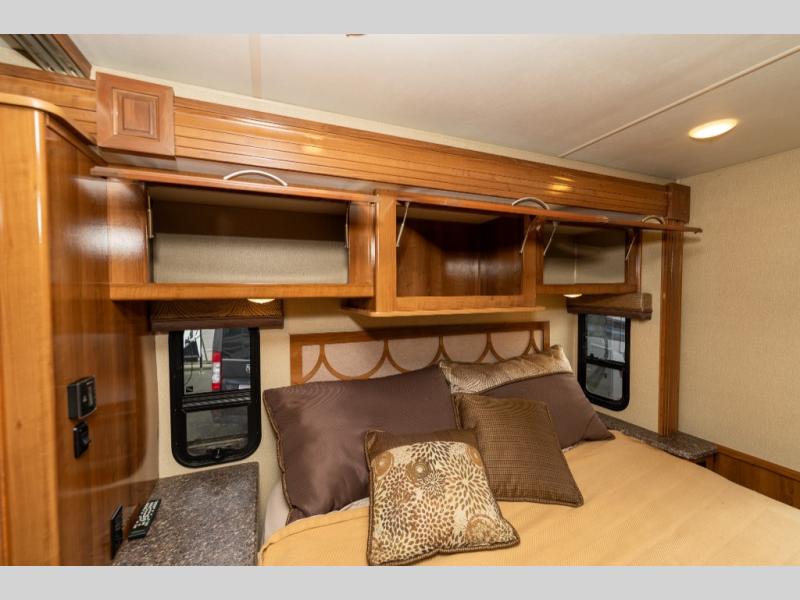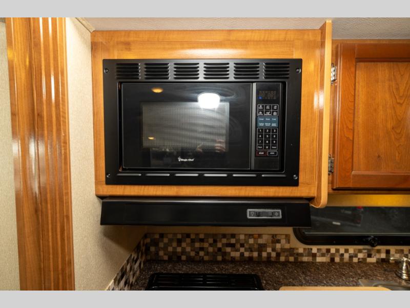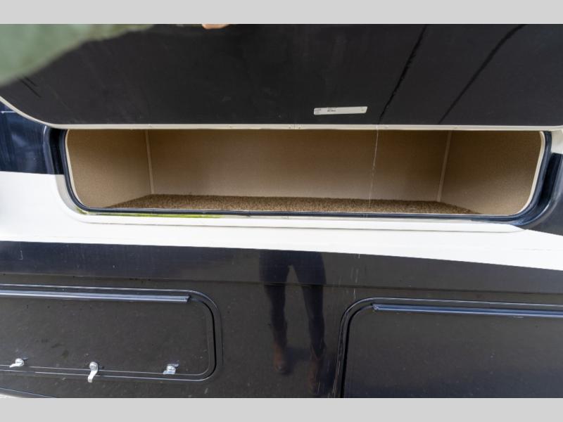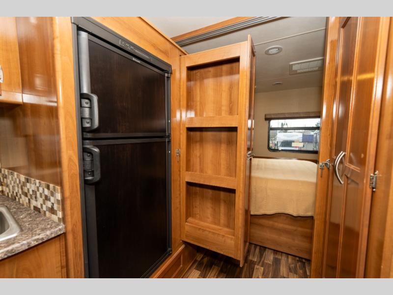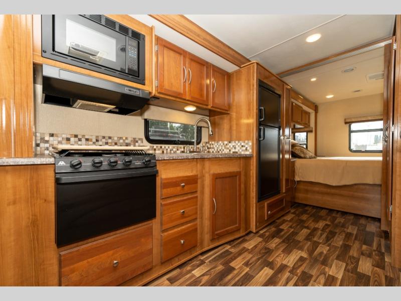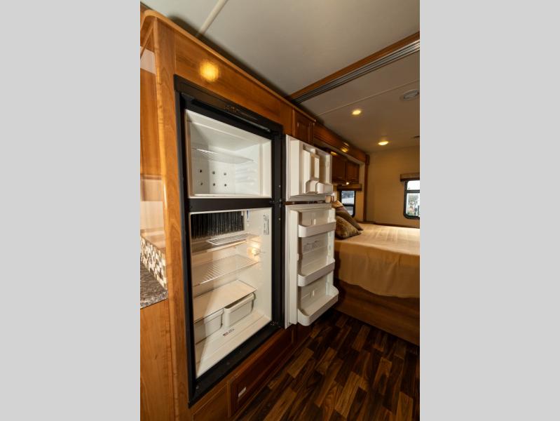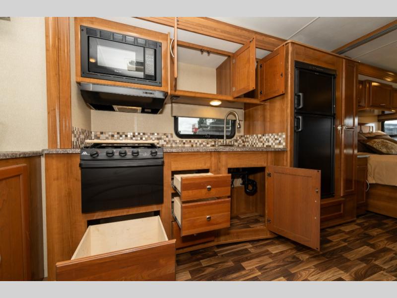 Model 27KB features a large passenger side slide out to the left of the entry door which provides a three burner range with overhead microwave oven, a double kitchen sink, refrigerator, and a pantry. This same slide also provides a rear bedroom king size bed with nightstands and overhead storage too.