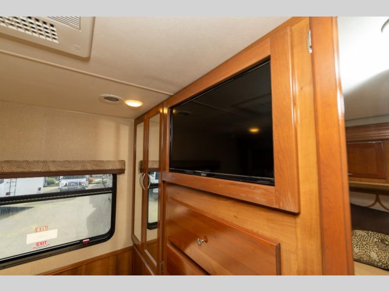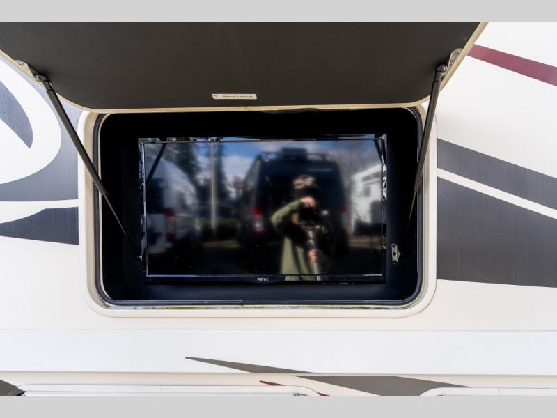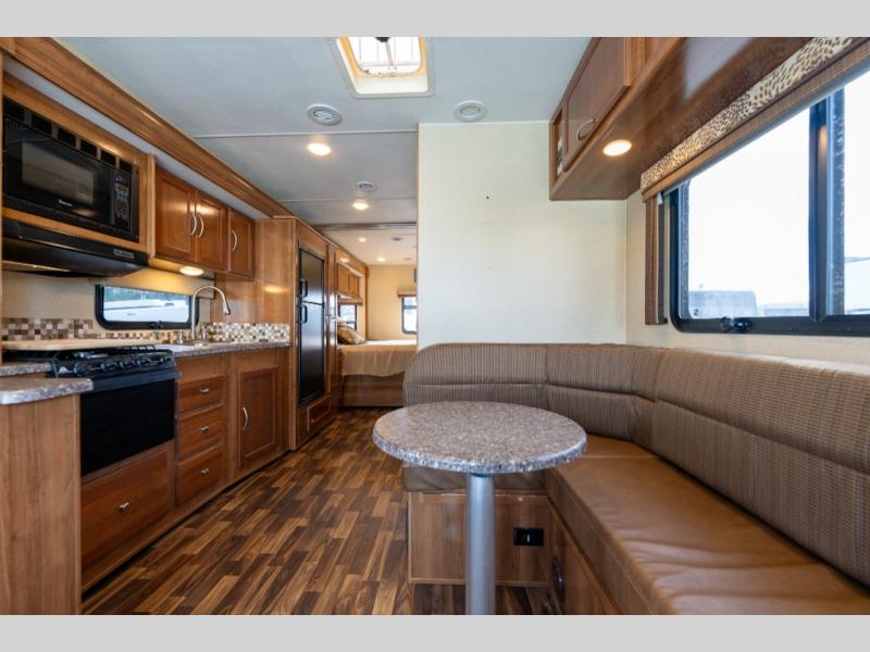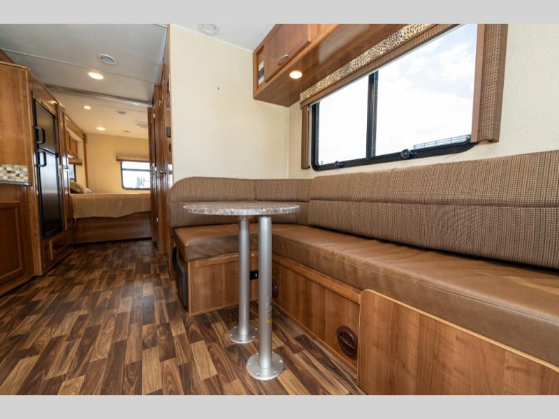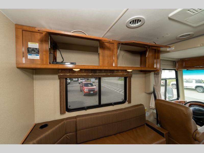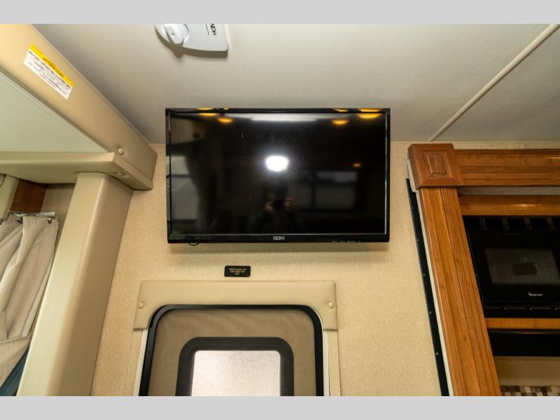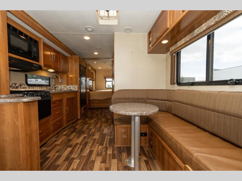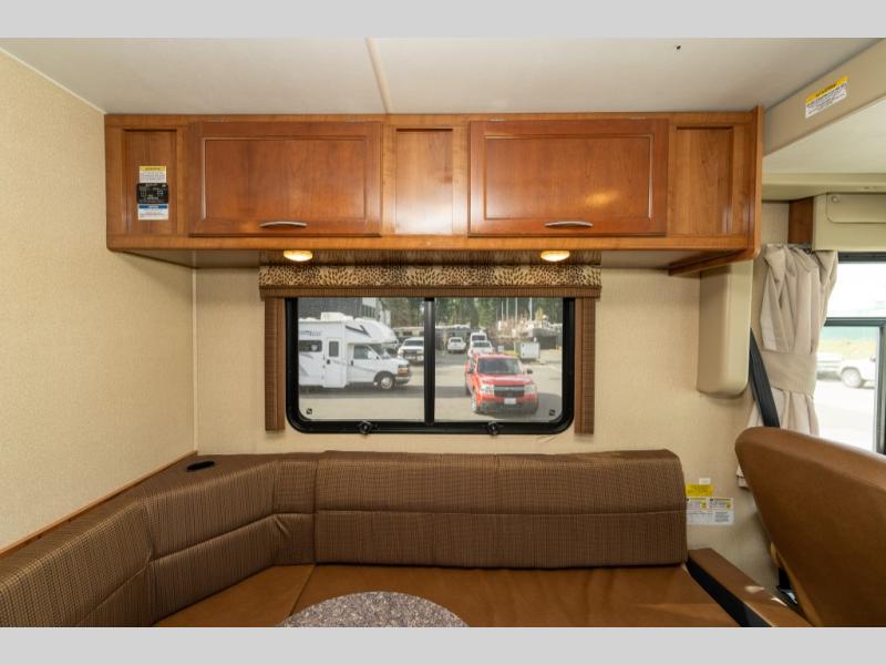 The driver side features an L-shaped dinette with extension so that it creates a u-shaped bench area for added seating. There is also overhead storage to keep things neatly tucked away when not being used. A 32" TV is mounted just over the entry door making it easily viewable.