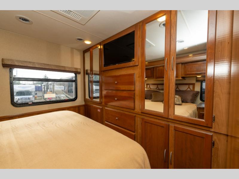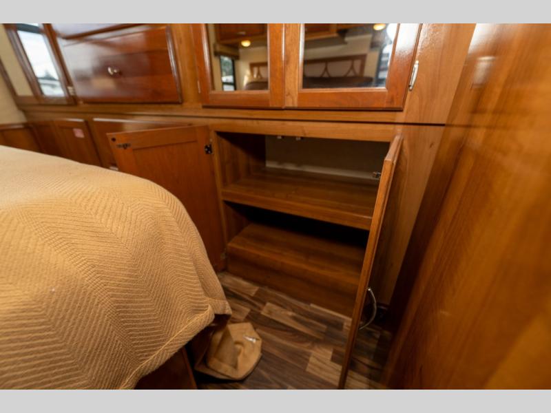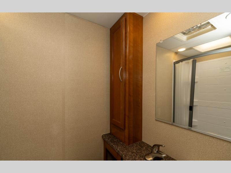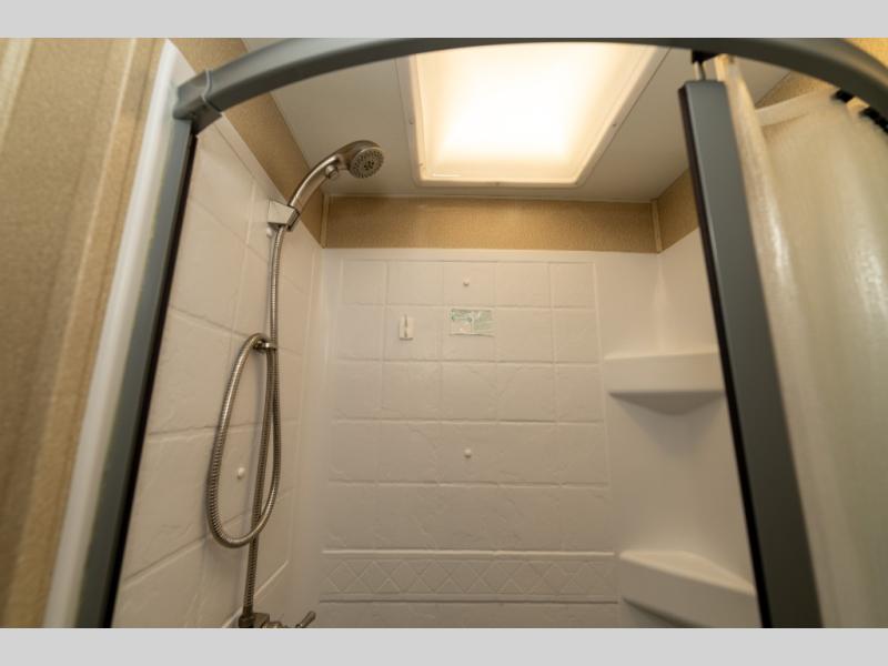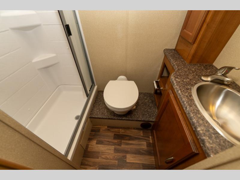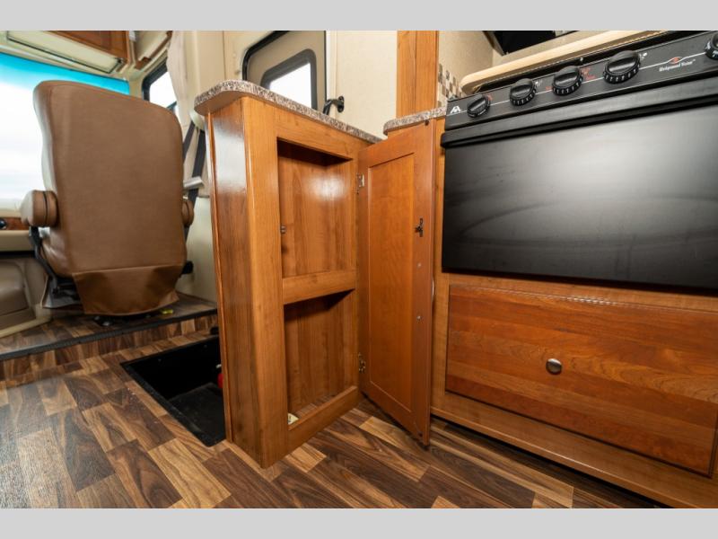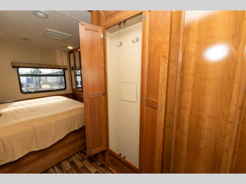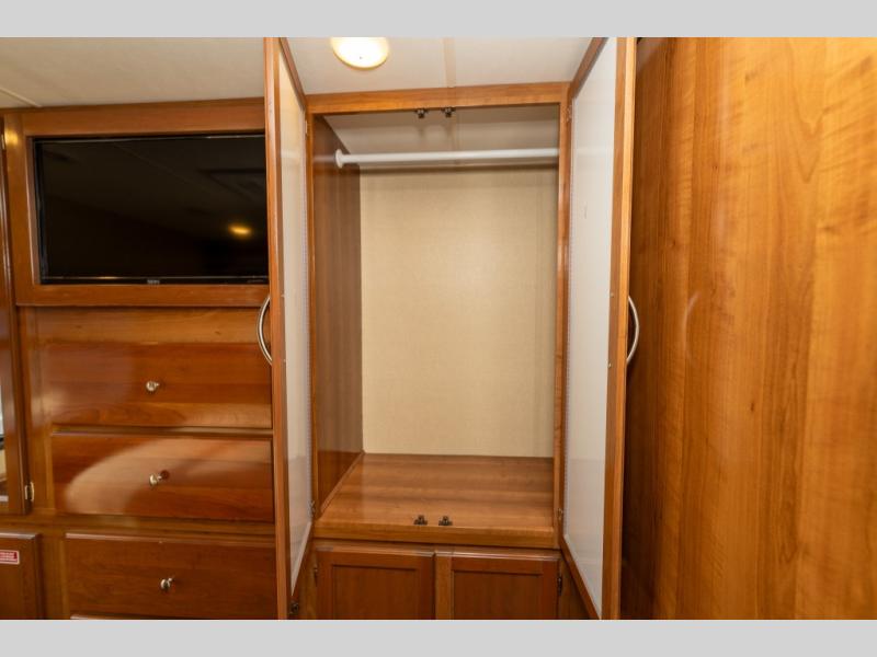 The driver side features an L-shaped dinette with extension so that it creates a u-shaped bench area for added seating. There is also overhead storage to keep things neatly tucked away when not being used. A 32" TV is mounted just over the entry door making it easily viewable.