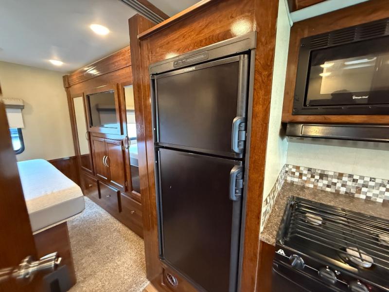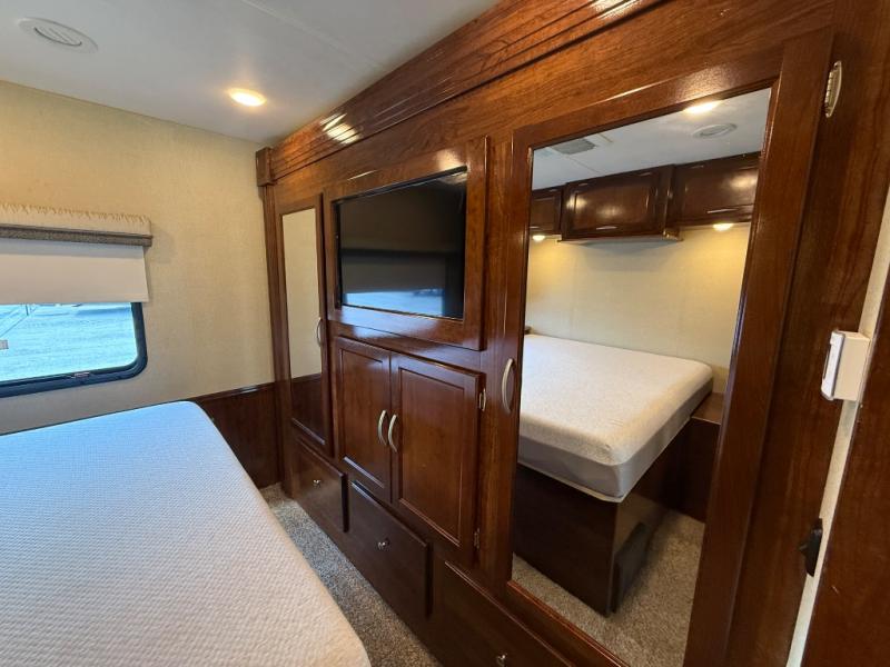 A sliding door closes off the rear bedroom area from the kitchen and living space. Here you will enjoy a queen size bed with overhead storage, along with nightstands. There is additional storage opposite the bed in wardrobes on either side of drawers within the full slide, plus there is a 32" LED TV for your enjoyment as well.