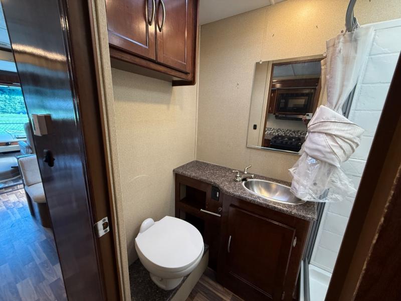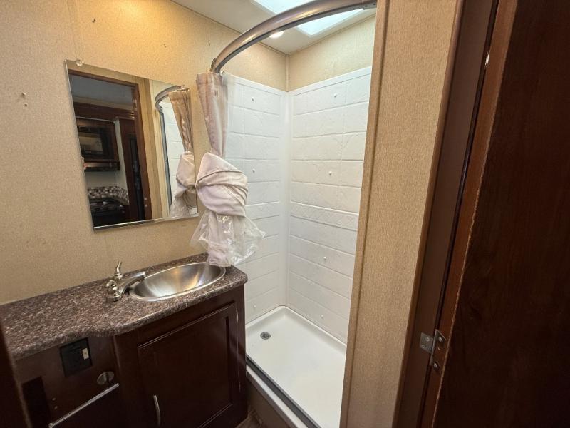 A complete bath can be found mid-coach opposite the full wall slide which features a 38" x 24" shower, toilet, and vanity with sink. There is also a broom closet just around the corner outside the bathroom to keep your cleaning supplies in.