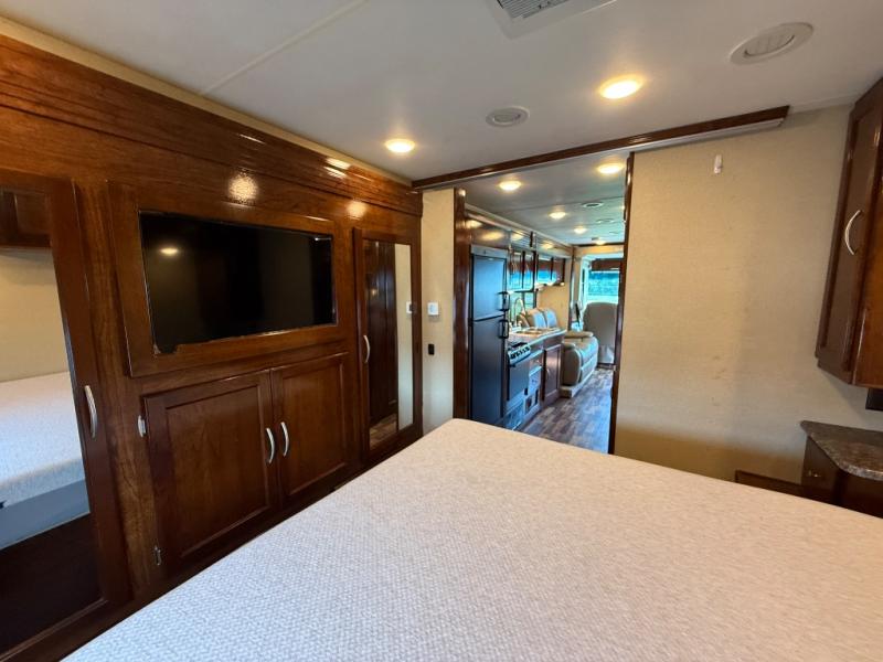 Step inside behind the passenger seat and take a look back. There is a 30" x 70" booth dinette with overhead storage along with a 32" LED TV for viewing to your immediate left. A 47" x 81" power drop down bunk over the cab area will readily provide more sleeping space when needed. You can also enjoy the cockpit table and computer workstation.