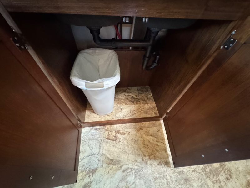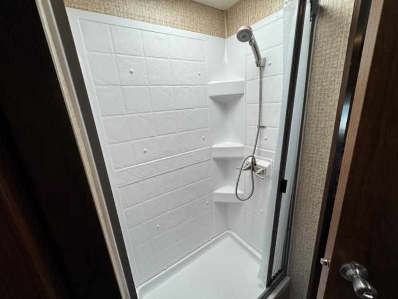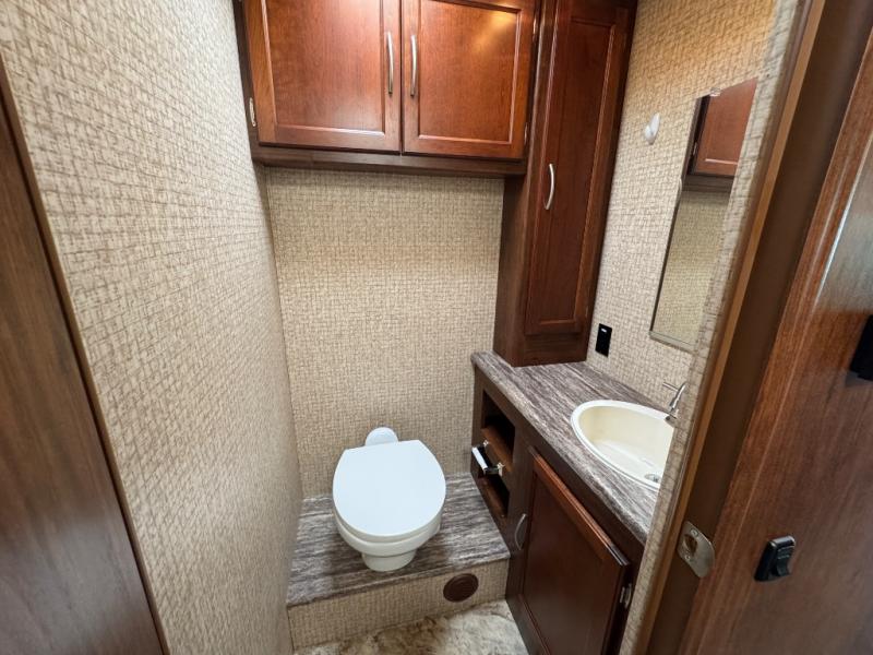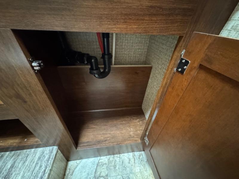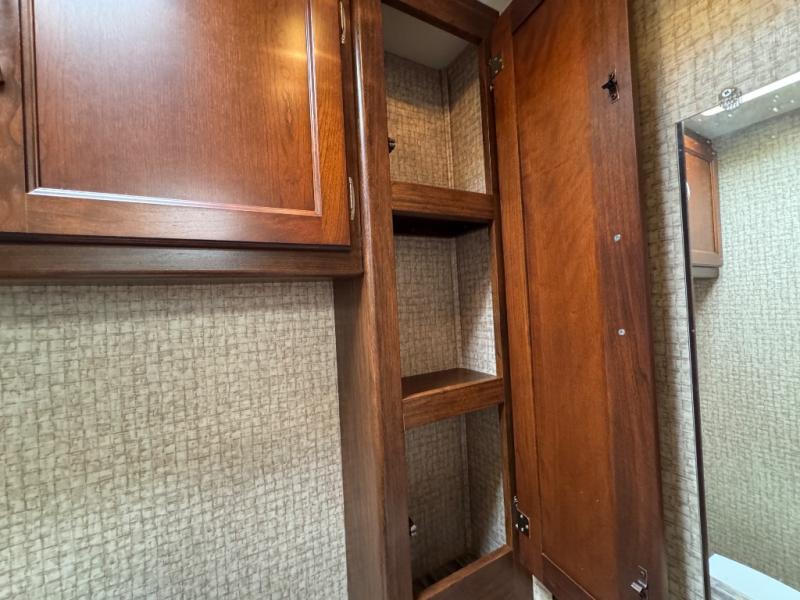 Continue toward the rear of the coach and find a split bath with a shower on the left and private toilet area with sink on the right. There is also linen storage for your towels and toiletries.
