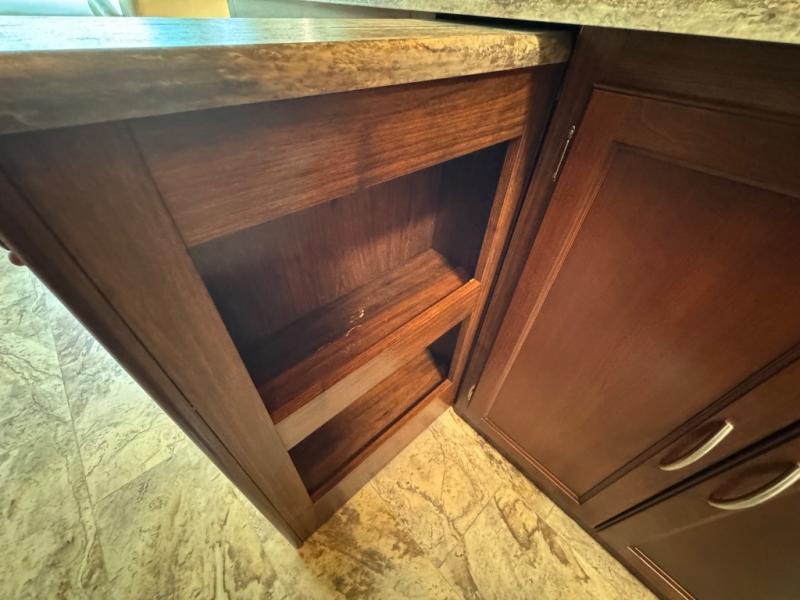 Opposite the slide is a complete kitchen featuring a pantry, refrigerator, a three burner range including overhead microwave oven, and a double kitchen sink for easy cleanup. There is also counter-top space and plenty of overhead cabinets to store dishes and things. The lower cabinet features drawers as well, plus there is a 32" LCD TV for your enjoyment above the counter area to the left of the door.