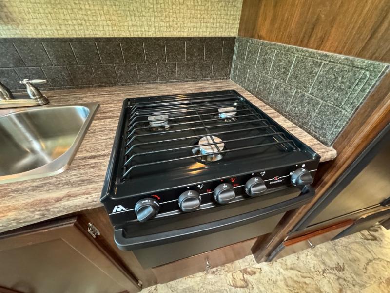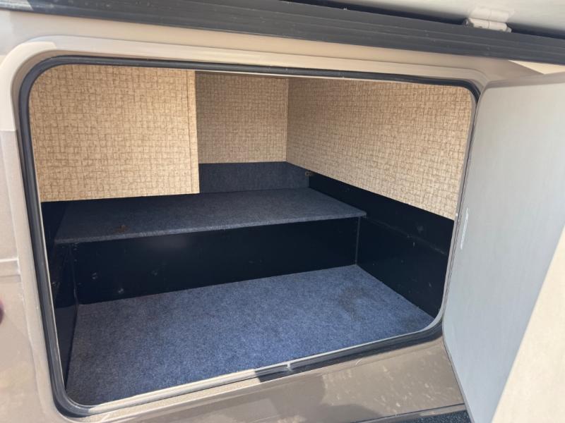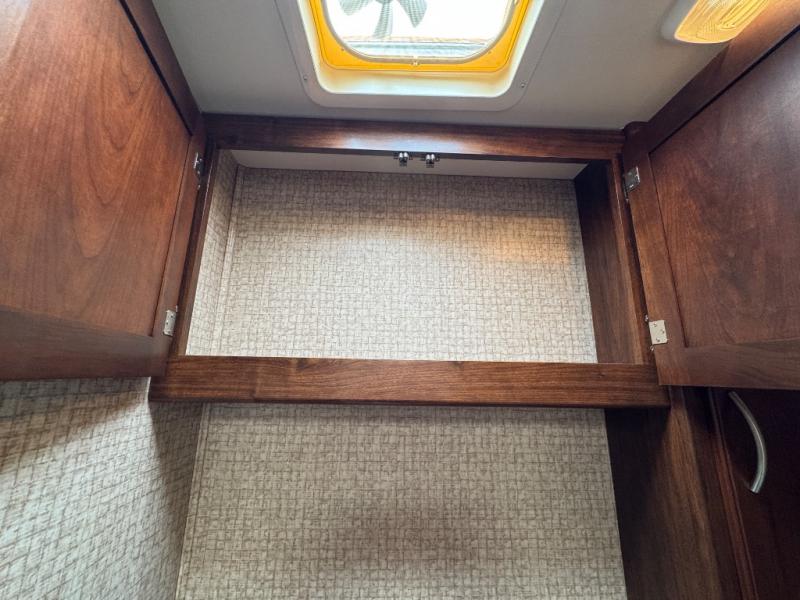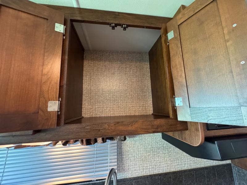 Step inside the entry door just beyond the passenger seat and see how spacious the main living area is with the large slide fully extended. There is a jack-knife sofa with overhead cabinet and a u-shaped dinette for mealtime or just hanging out.