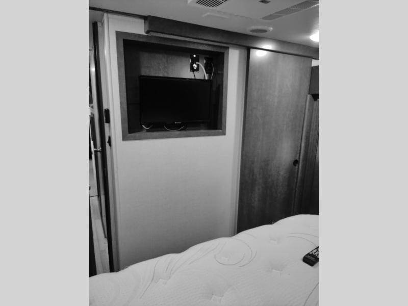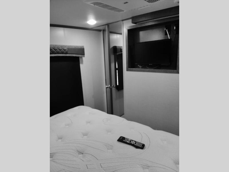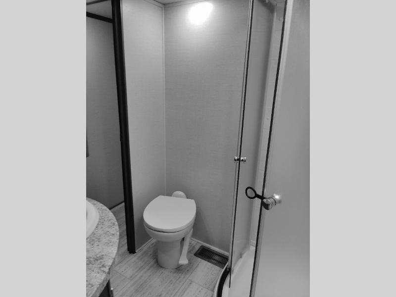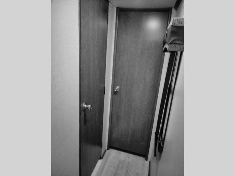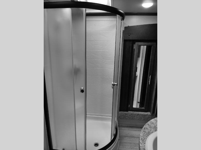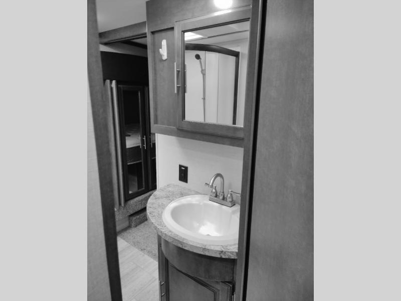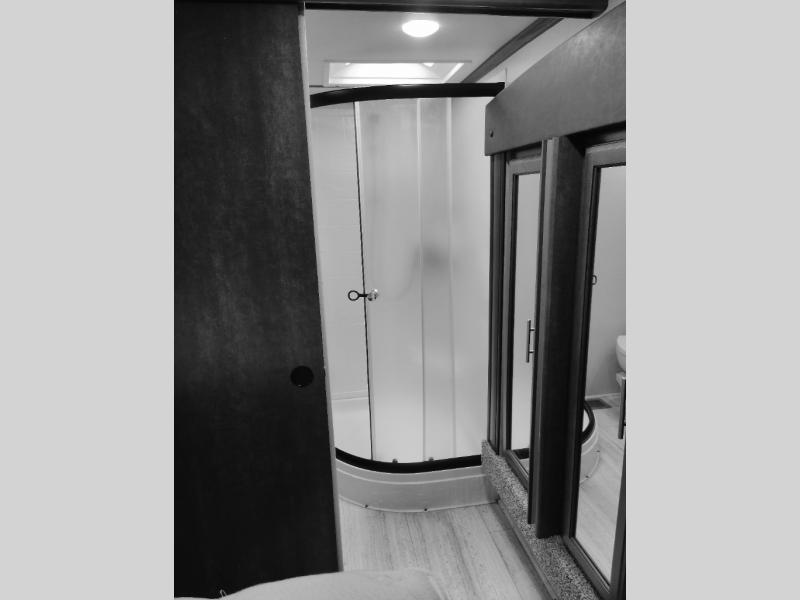 Continue toward the front of the unit and find a side aisle bath including a 34" x 34" shower, toilet, and vanity with sink. A second sliding door allows easy access into the front master bedroom as well as access to the slide out linen/wardrobe storage.