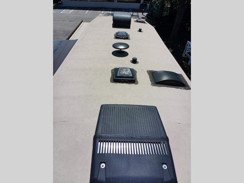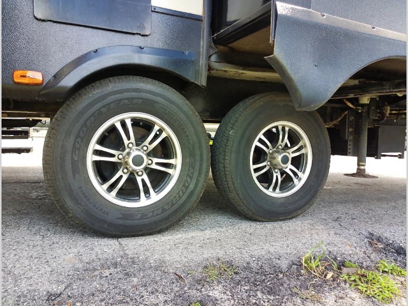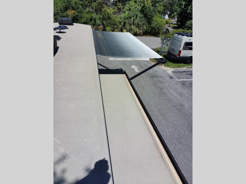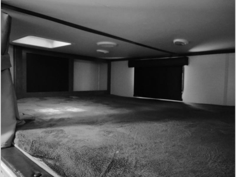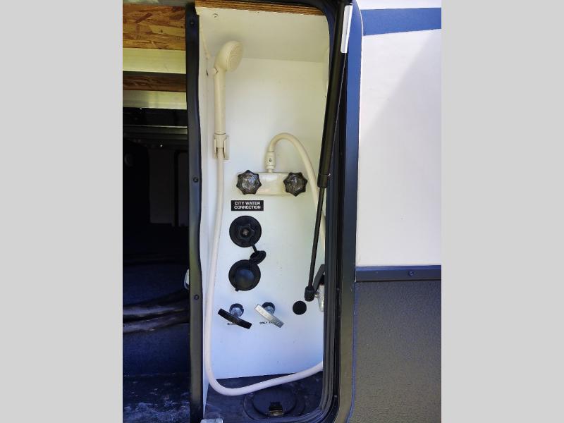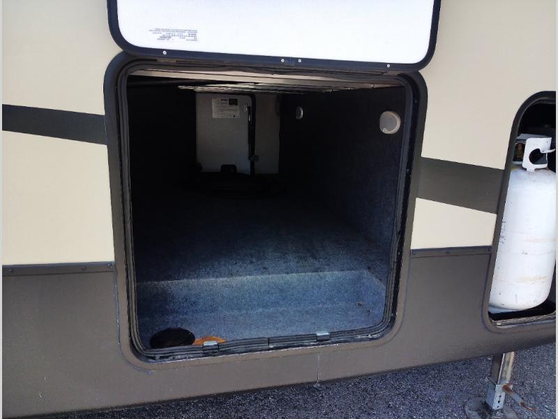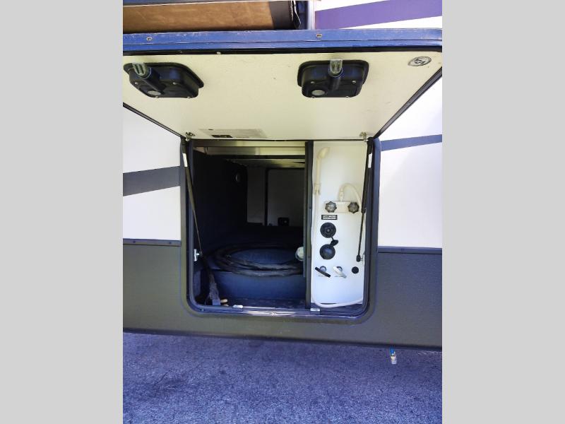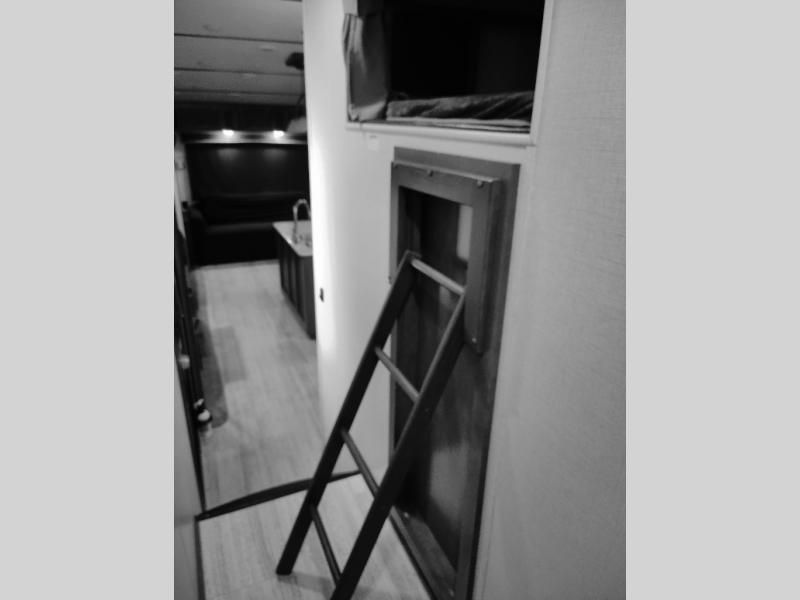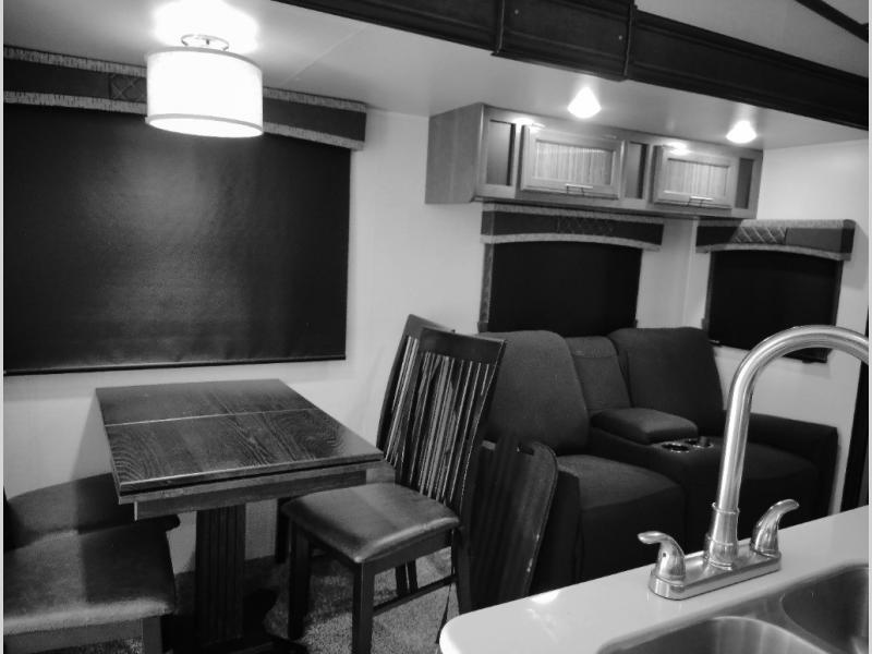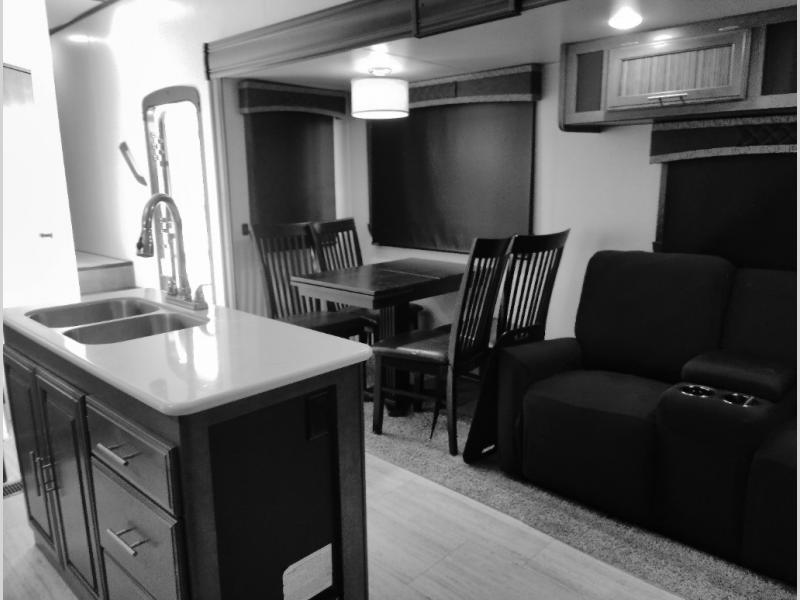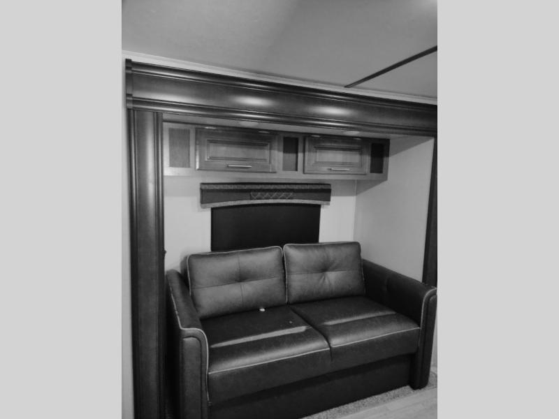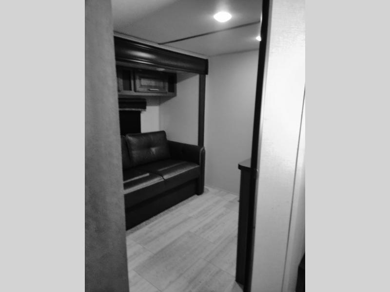 On the inside check out the dual opposing slides in the rear combined kitchen and living space. There is a dining table with four chairs, and a theater seat for two in a slide out along the curb side. Across the back of the unit there is a 85" sofa with nightstands, and overhead storage. This can easily be transformed into a bed at night for overnight guests.