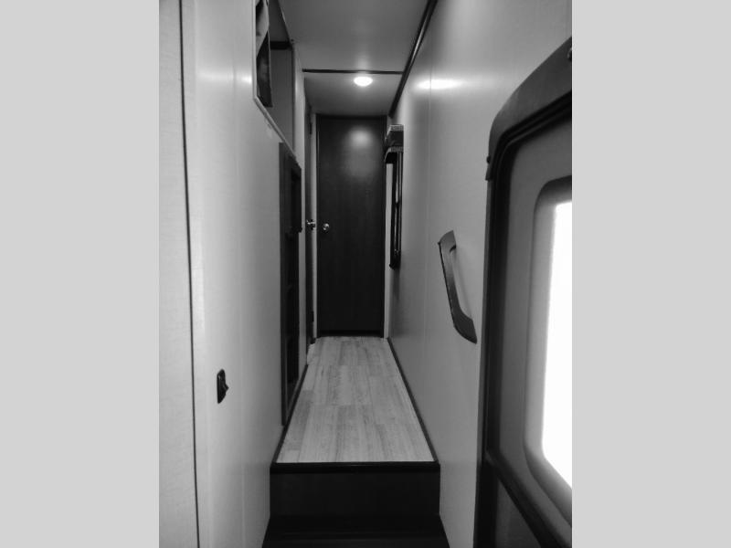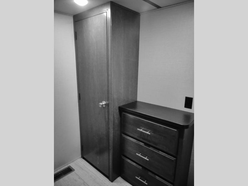 In the middle of this Cruiser fifth wheel you will find a private den/office which can also double as a bedroom. Plus there is a loft overhead with a 64" x 75" sleeping mattress. The room features a 64" tri-fold sofa slide out with storage overhead, and a dresser opposite, along with a wardrobe for clothing and linens. The loft can be accessed in the entry hall at the top of the steps up.