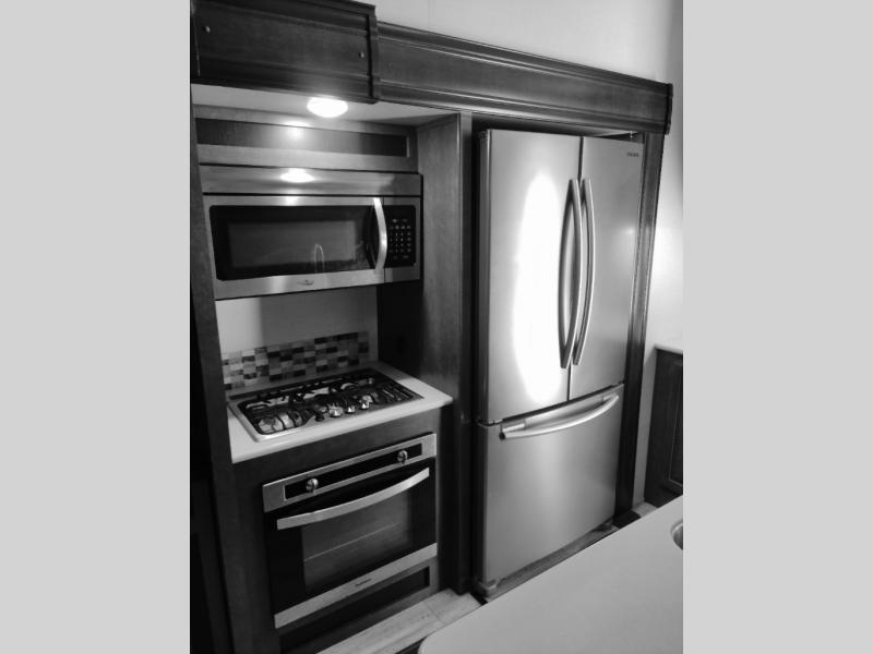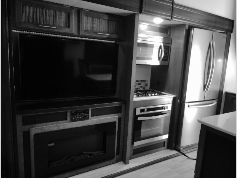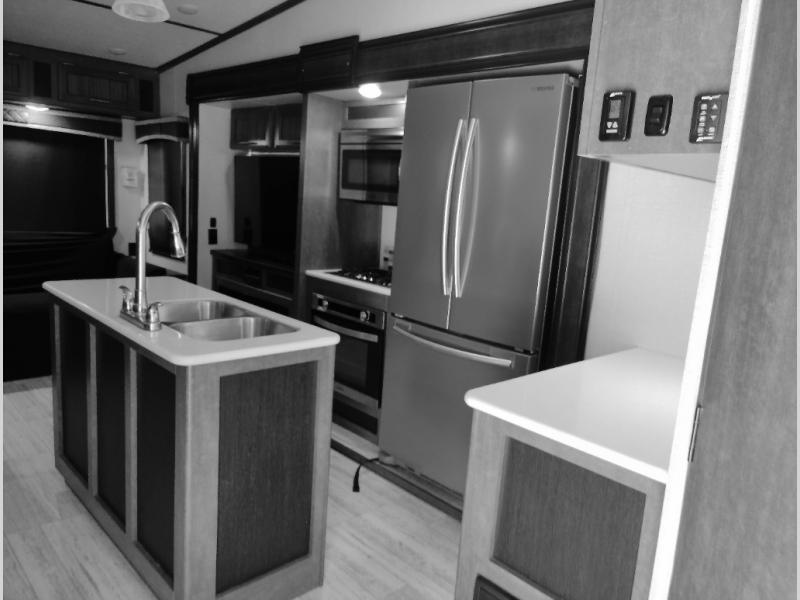 Adjacent, the second slide in the space features an entertainment center with fireplace below, plus overhead storage for your things. This slide also features a three burner range with overhead microwave oven, and a refrigerator. The pantry is just off the slide along the interior wall. Here you can keep stocked up on canned and dry goods all during camping season. The center island is perfect for food prep, and cleaning up is super simple too as this is the location of the double sink.