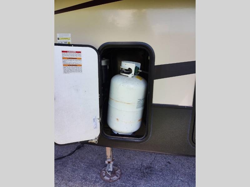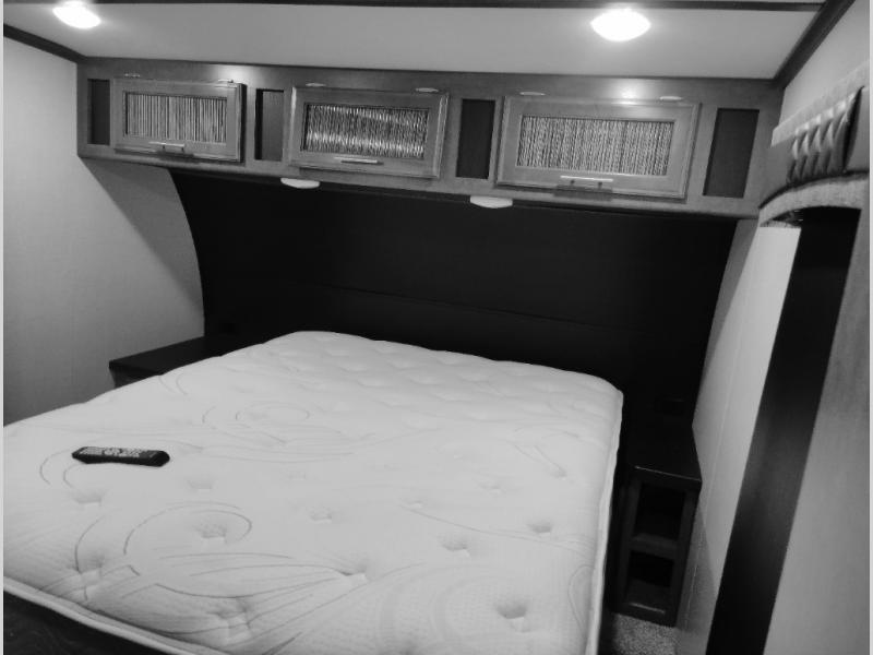 In the front bedroom you will certainly enjoy a great night's rest on the queen bed provided. On either side of the bed there is a nightstand with chest above. The slide out creates a larger floor space and room for moving about.