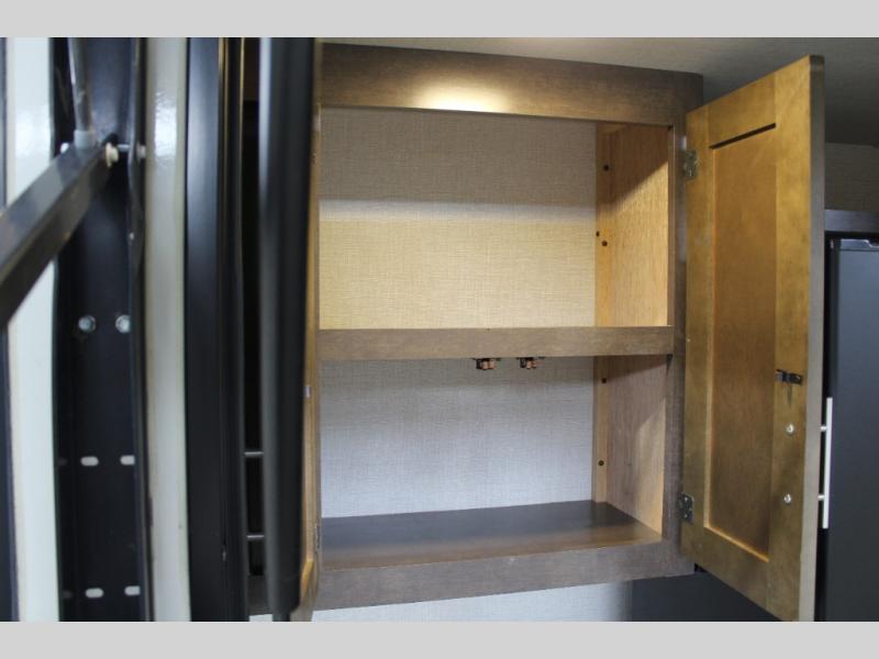 The outside kitchen features a single sink, refrigerator, and storage. On the inside, just inside the door to your left, you will find a refrigerator, a three burner range with overhead microwave oven, and a bit of counter space and storage within a slide out which creates more interior floor space to move around. There is a pantry/wardrobe just off the slide out on the interior, plus a large island with double sink, and more storage.