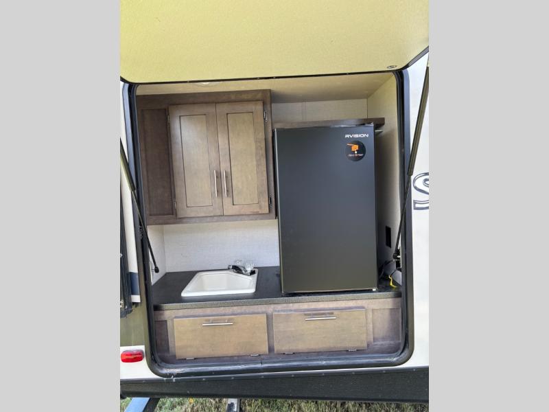 Check out this exterior kitchen before heading inside. Here you can have easy access to your favorite drinks and snacks all while enjoying the outside when it is nice. There is an outdoor refrigerator, a single sink, plus storage.